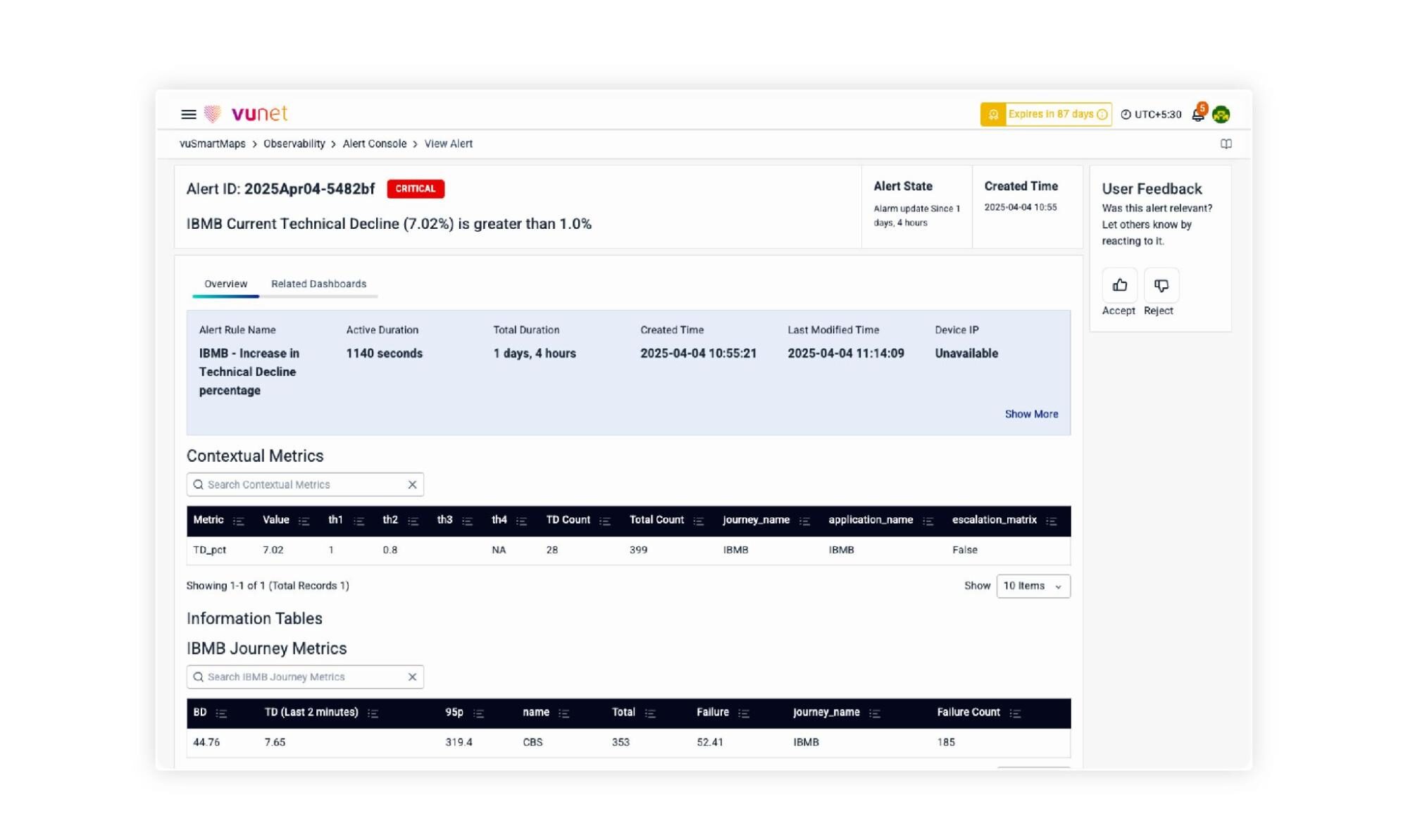 Using AI, VuNet detects early signs of issues — like unusual latencies or failure patterns — and raises alerts before customers are affected. This allows customer support and relationship managers to proactively inform high-value customers or prepare for increased queries.