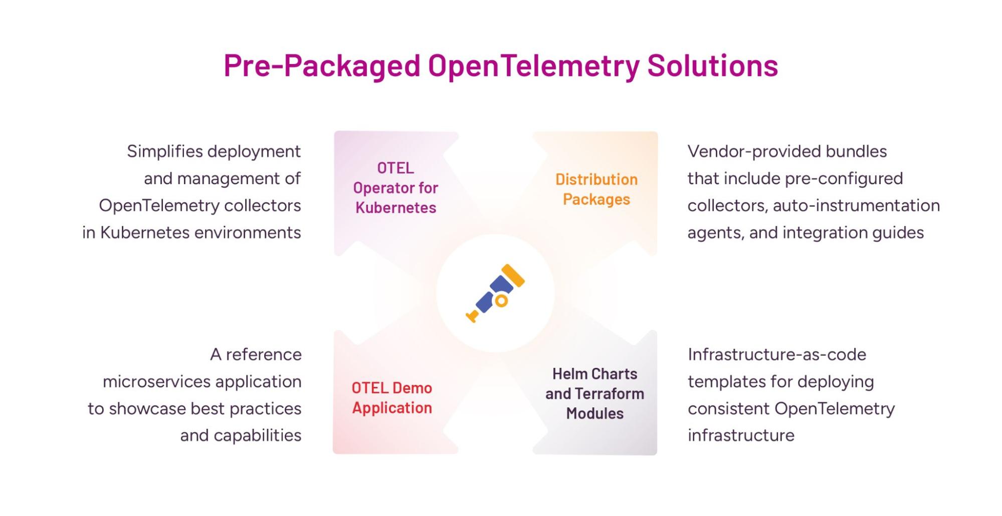 The OpenTelemetry ecosystem has developed several pre-packaged solutions to simplify adoption and help teams onboard faster with minimal friction.