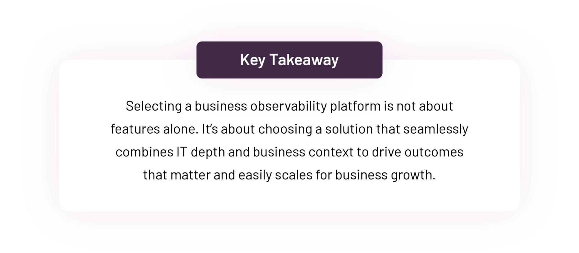 Arjun: Exactly. High-performance business observability is about context, scale, and insight. Get that right, and you not only justify the investment but future-proof it. And remember another thing. Selecting a business observability platform isn’t just about comparing feature lists. It’s about choosing a strategic partner that will: