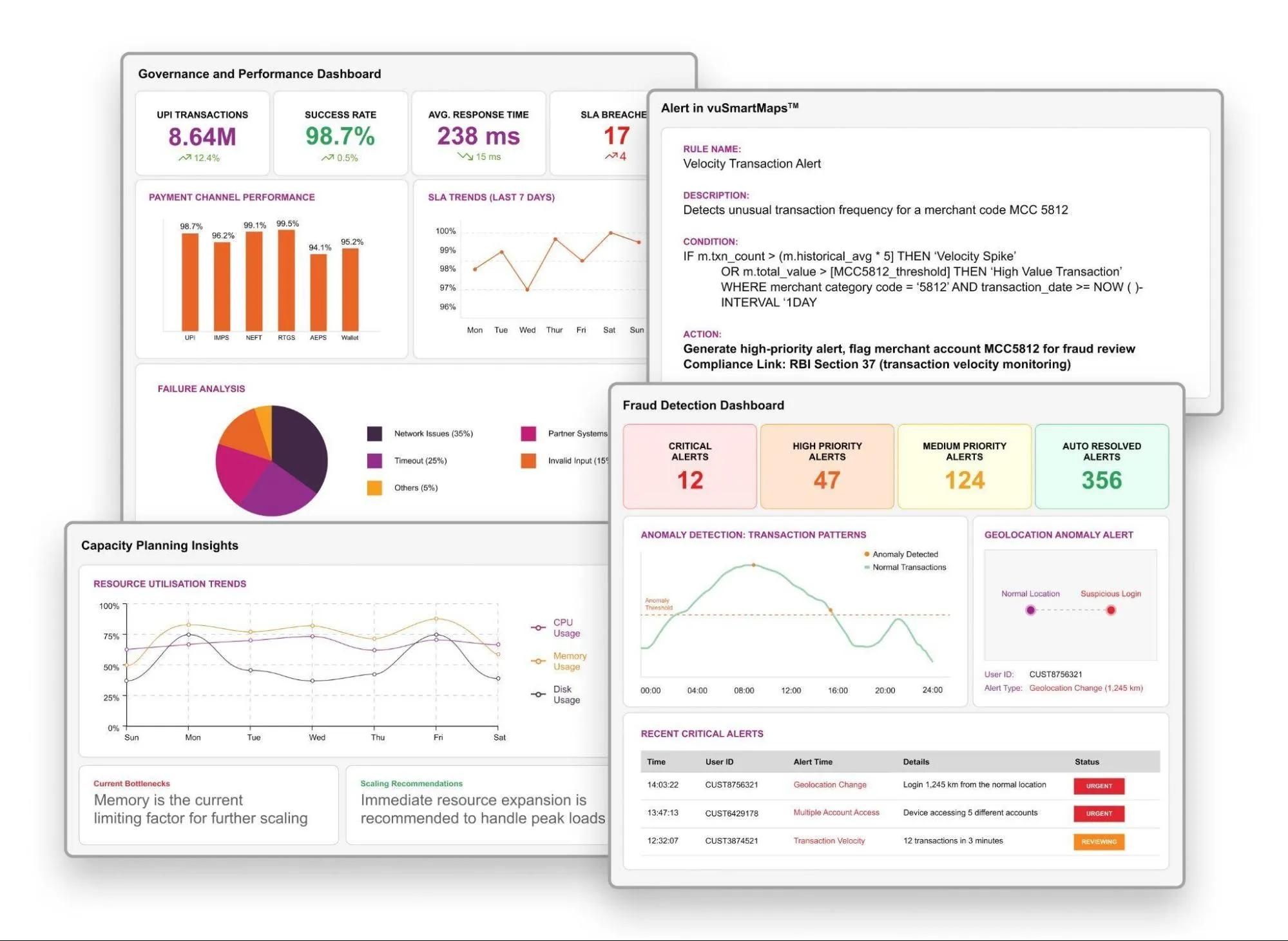 Built for compliance and resilience, vuSmartMaps™ is VuNet’s Business Observability Platform, designed from the ground up to provide real-time, scalable, and intelligent visibility into digital payments. It combines big data, AI/ML-based correlation, and deep domain context to provide a unified view of: