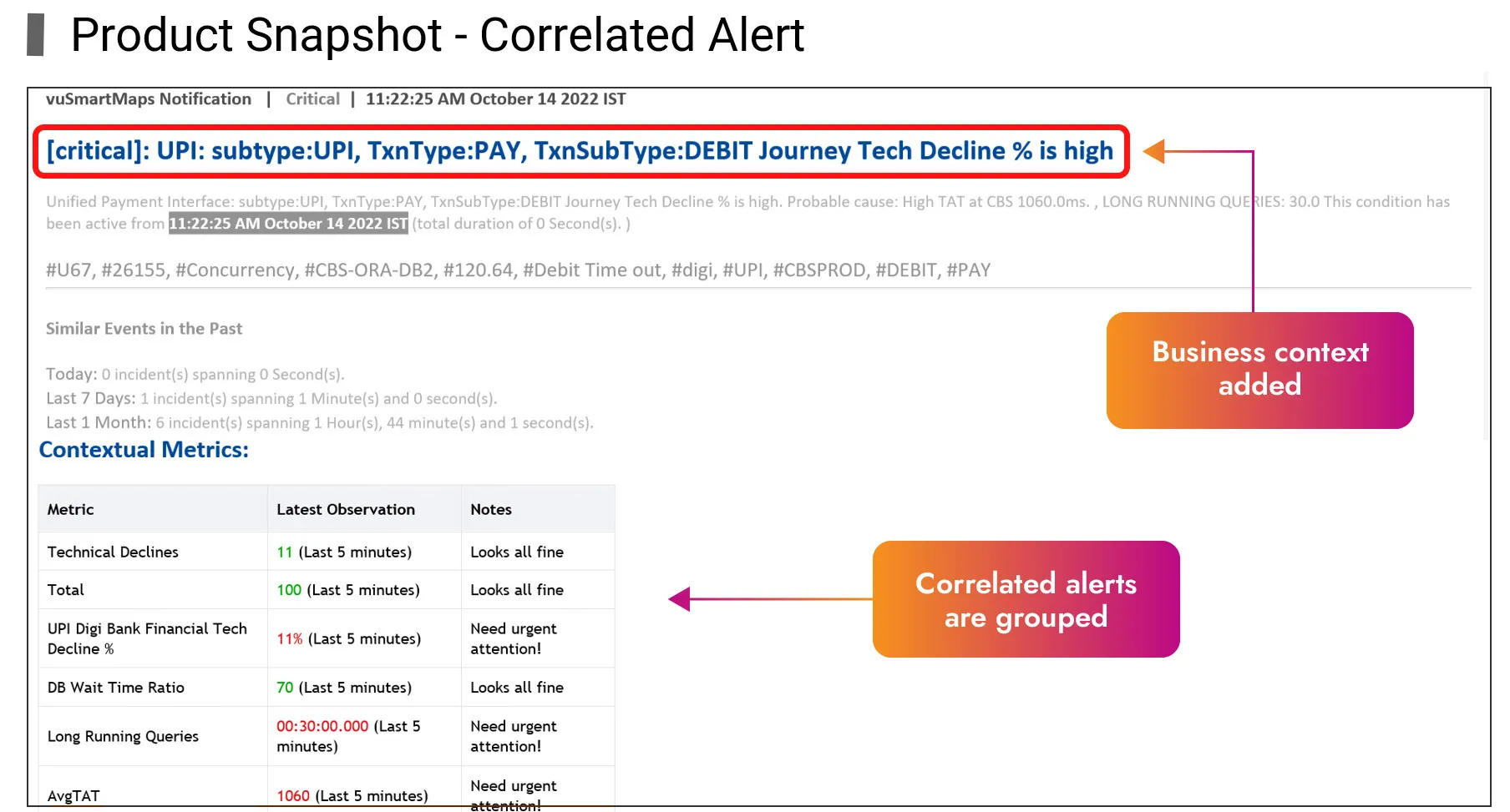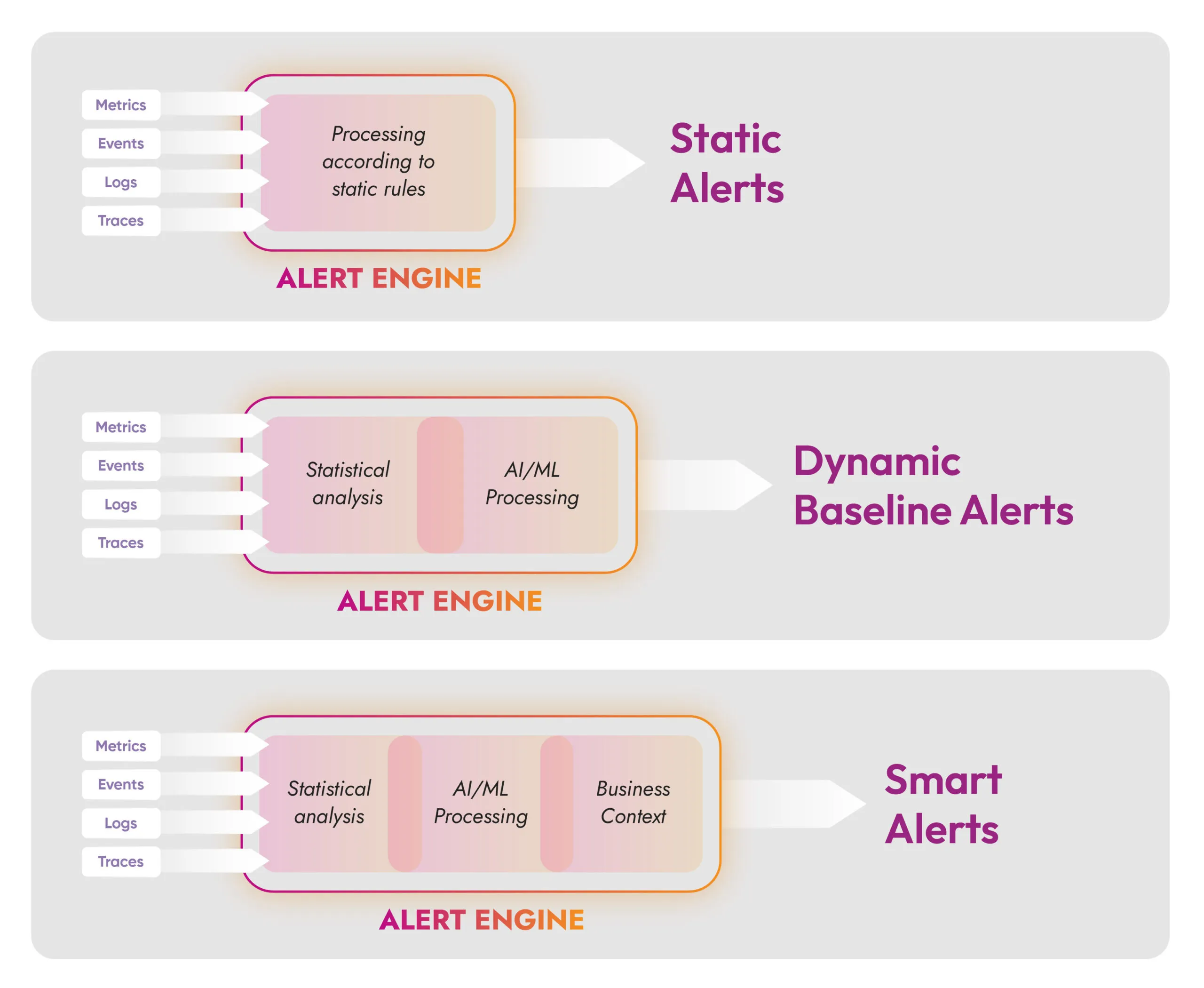 Traditionally, alerts are configured using static thresholds and are triggered when the specific conditions are met. However, as systems evolve and applications grow more complex with the adoption of microservice architectures traditional rule-based static alerts are often inadequate. This led to the development of dynamically fixed threshold alerts, which adjusted thresholds based on historical data and trends. However, they still lacked the depth and insight needed for truly proactive and efficient IT operations.We further were closely collaborating with our clients to understand their evolving needs, especially with dynamic environments and studied 100s of alert samples. Through these on-ground learnings and R&D efforts, we created various scenarios to simulate real-world challenges, mixing operational environment and business impacts. This comprehensive approach involving numerous iterations and rigorous testing within our platform to ensure our alerts could adapt and scale to the constantly changing IT landscape. This process has allowed us to shape smarter features in our alert module and ultimately launch ‘Smart Alerts’, our latest and advanced alerting engine.Smart Alerts brings together advanced analytics, customized ML Models to provide accurate and actionable notifications. These alerts go beyond dynamically adjusting thresholds by incorporating 3T correlation (Time, Transaction Topology, and Transaction ID), a high degree of programmability, and most importantly bring in business and user context. They correlate related incidents, perform root cause analytics, and most importantly, enrich alerts with business context. This means they highlight which parts of the business are impacted by specific problems, allowing IT Operations to prioritize resolution processes effectively. This ensures that the most critical issues are addressed first, enhancing both efficiency and precision.