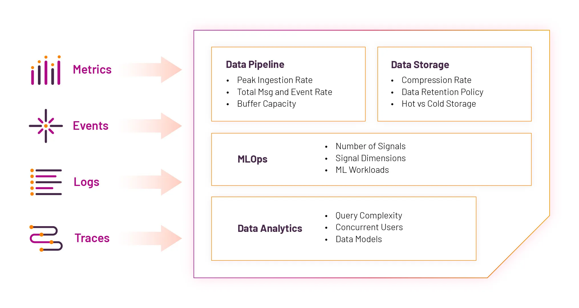 Each telemetry source, whether from logs, metrics, traces, or events, creates unique demands on the observability platform. Understanding the telemetry mix and scoping accurately avoids unnecessary overprovisioning and ensures the right balance between performance and cost efficiency.