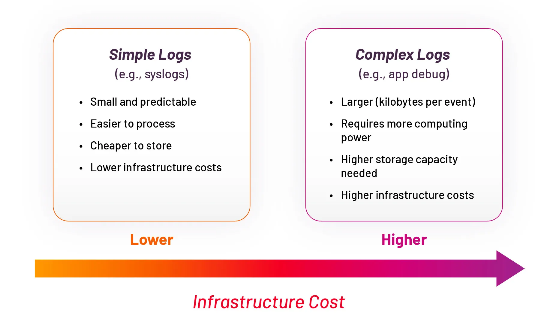 - The larger the log files, especially during peak hours, the higher the infrastructure costs, including computing, memory, and storage, both on-premises and in the cloud.