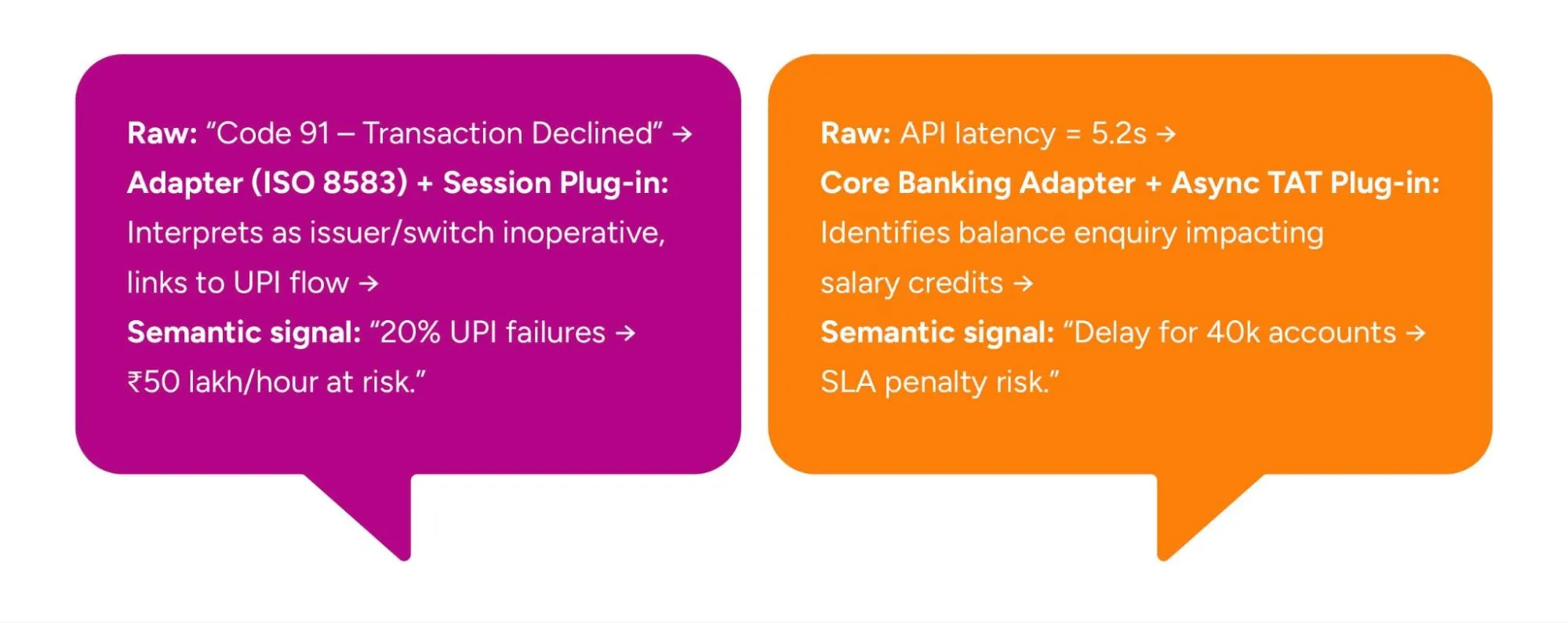 Our platform offers pre-built agents and session plug-ins that have been built with a deep understanding of industry-specific business processes and in compliance with industry standards such as payments, core banking, ISO 8583, ISO20022, asynchronous service calls, etc. These agents, forming a part of our platform’s contextualization component, enrich the raw MELT data with rich context, including business, domain, semantic, syntax, and state. The data contextualised by these agents helps in: