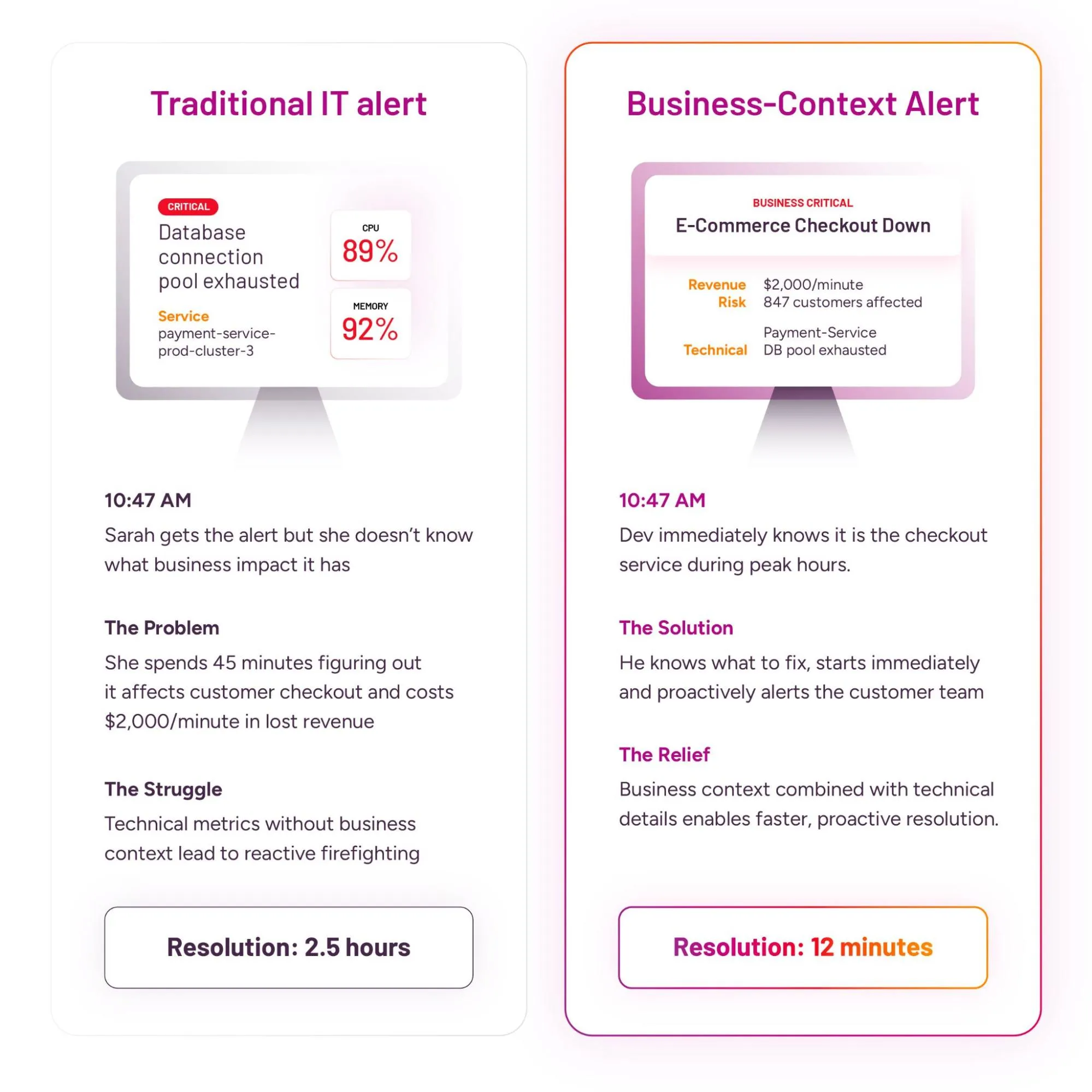 - Context-aware alerting: Alerts are enriched with business impact before reaching operations teams.