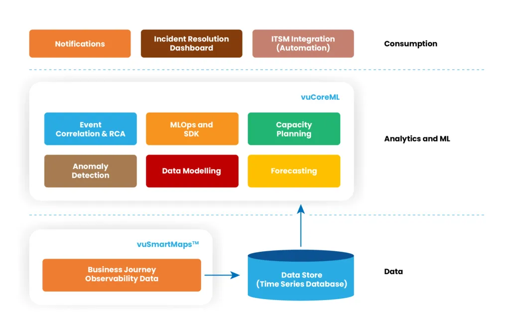 In our blog entitled “Sowing the Seeds of MLOps in the Soil of vuSmartMaps™,” we spoke about VuNet’s vuCoreMLOps product, which is built on our Business Journey Observability platform vuSmartMaps’ information architecture. vuSmartMaps™ provides the necessary infrastructure for AI algorithms and ML models to be built upon it, as can be seen in the following diagram: