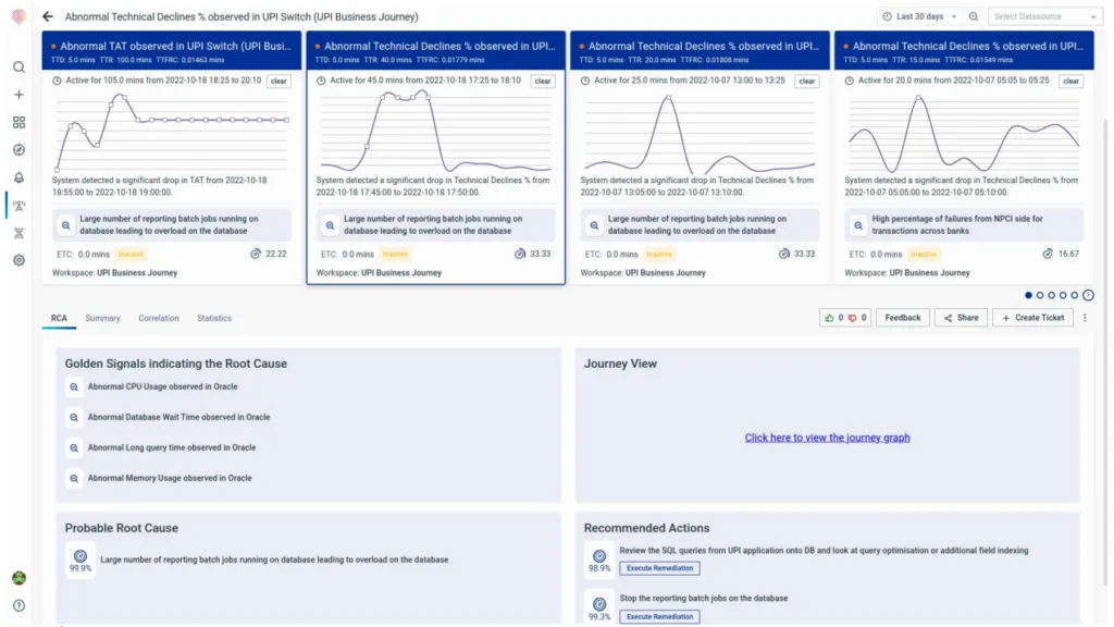 • Predicting and preventing instead of reacting – Unlike conventional monitoring systems which are manually run and reactive in nature, vuRCABot uses anomalies on infra metrics and lead indicators on journey metrics to envision future incidents before operations get interrupted, thereby preventing critical outages, and reducing downtime and maintenance costs.