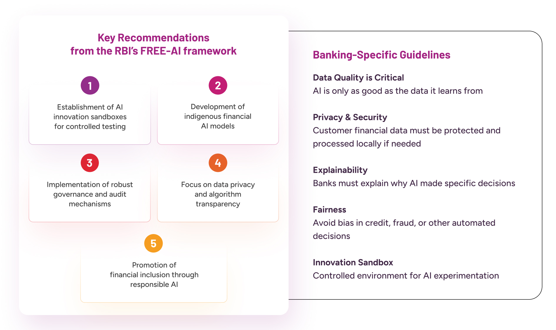 To guide safe adoption, regulators are setting clear expectations. For example, the Reserve Bank of India (RBI) has recently introduced the FREE-AI Framework – a blueprint for responsible and ethical adoption of AI in the financial sector. It is based on seven principles or “Sutras”: Trust, Fairness, Accountability, Sustainability, Transparency, Privacy, and Reliability.