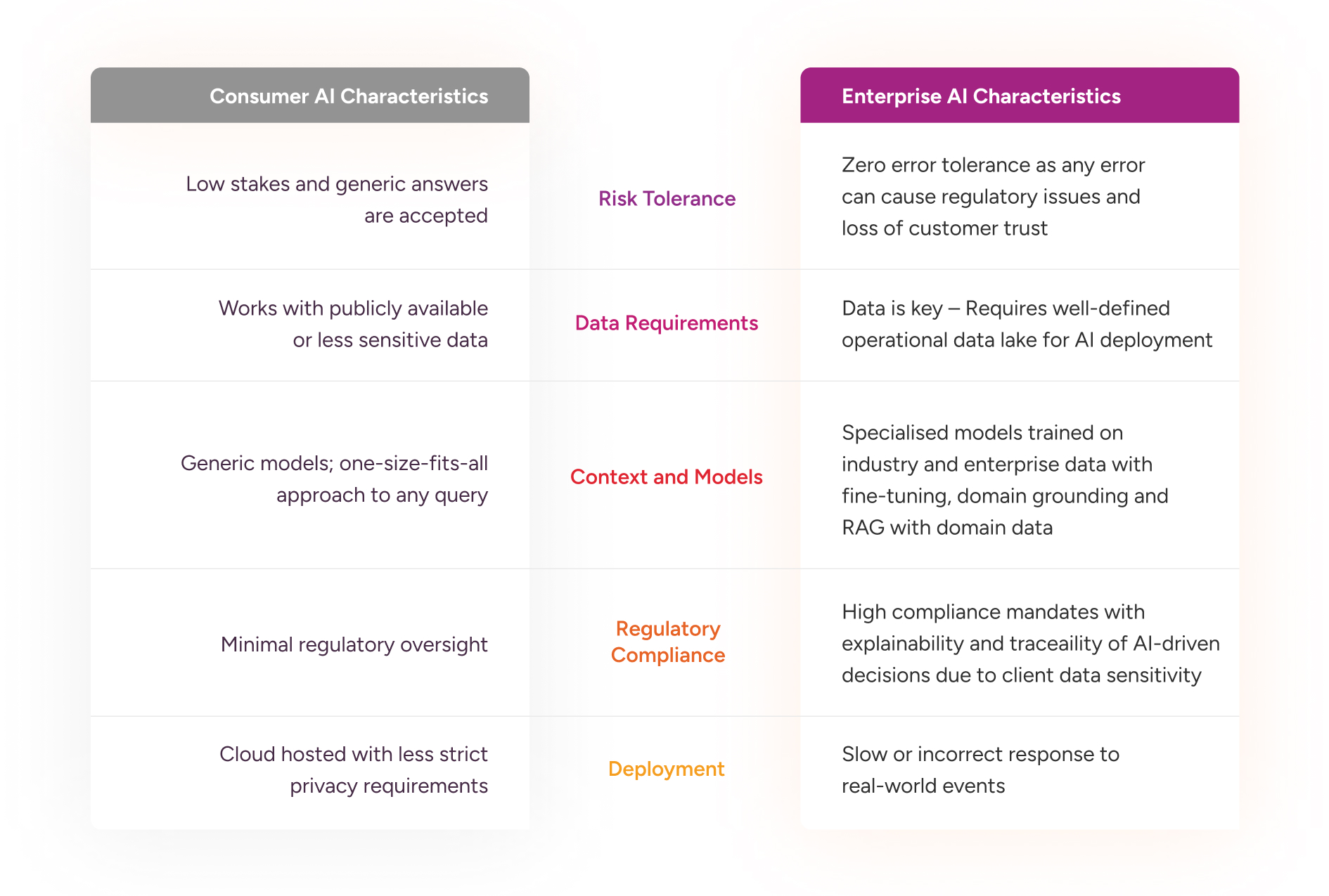 Consumer AI is built for convenience. Enterprise AI is built for scale, resilience, and compliance. The difference is like comparing a paper plane with a commercial airliner – they both fly, but the requirements, complexity, and stakes are entirely different.