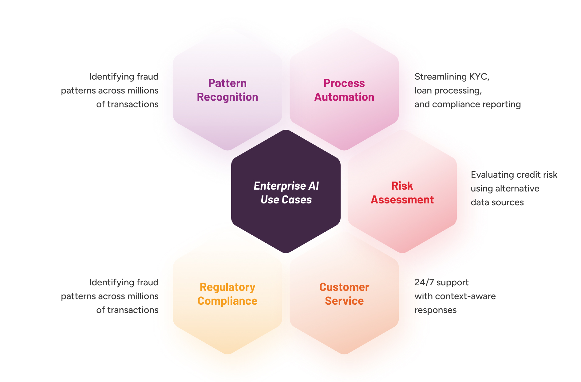- Back-End AI: Automating loan processing, Fraud detection, transaction monitoring, underwriting, and credit risk scoring.