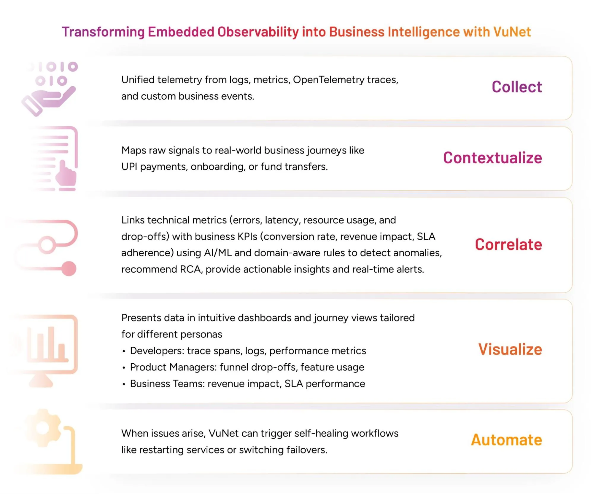 While embedded observability gives engineers visibility into business-relevant signals, VuNet transforms that into business clarity with AI-powered insights, real-time analytics, and actionable storytelling. It brings business context into observability data—connecting technical signals to KPIs, user journeys, and transaction flows.
