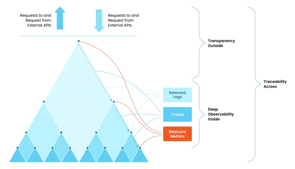 Deep Observability Inside entails the transition from monitoring to Unified Observability to Business Journey Observability to AIOps and Automation. Logs and metrics need to be collectable from every component of the infrastructure, and the logs must have sufficient granularity of error messages or responses returned by API gateways of external systems. High cardinality of logs, metrics, and lead indicators on traces are the other aspects to consider during data collection and ingestion. This mandates the adoption of better logging practices and DevOps for embedded observability via Open Logging, Open Telemetry and other standards implemented across the board.In the interconnected digital enterprise, a "black-box" API that is difficult to debug and understand hinders the ability to view a trace in its entirety, which in turn affects the ability of ITOM teams to troubleshoot issues at a transaction level, as well as the availability of data for rendering BizOps dashboards to perform drilldowns based on the health of the enterprise's and partners' APIs, and various business and IT error codes. Hence the need for Transparency Outside, enabling the enterprise to provide real-time views into its partner ecosystem. By establishing a clearly defined contract based on mutual trust and well-documented method signatures at every internal and external API interface, the enterprise can promote transparent interactions between integration partners. Additionally, APIs and microservices should clearly state which data points are being exposed to facilitate troubleshooting, thereby promoting the concept of Transparency Outside.With complex heterogeneous environments, every transaction traverses multiple touchpoints across disparate infrastructures – some internal, some external. In addition, infrastructure level metrics also need to be collected from external elements like payment switches, network switches and storage devices. This has a direct bearing on the visibility we have into the IT and business metrics of the journey. Interactions in multi-party systems are not always observable, which means that there might be some steps in a transaction we are unable to trace. This leads to the question: When there is a dispute or a customer complaint, how can the ID of a specific transaction in question be traced? How can better interconnection be facilitated across disparate entities to identify failure points? How can every micro-leg of a transaction be traced without compromising on privacy considerations? This is why Traceability Across is required.vuOTT enables further evolution towards Business Journey Observability by collecting all the data points necessary for end-to-end visibility at a journey-level, thereby unifying all the eco-system stakeholders (internal and external) in the single pane of glass.