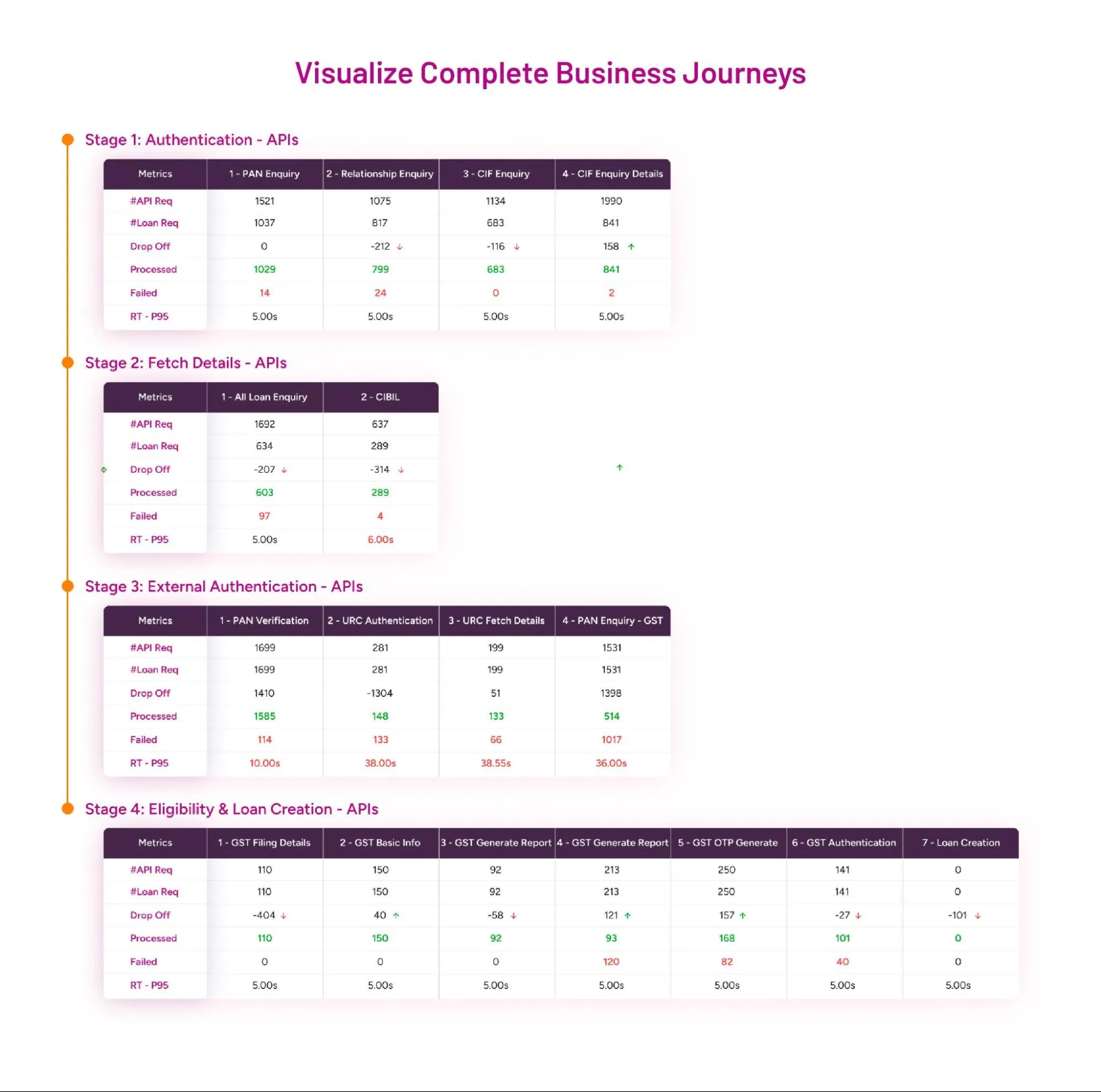 - End-to-end journey visibility: Visualize each customer action—from loan application to disbursement to EMI payment—in real time, with visibility into internal systems and partner networks.