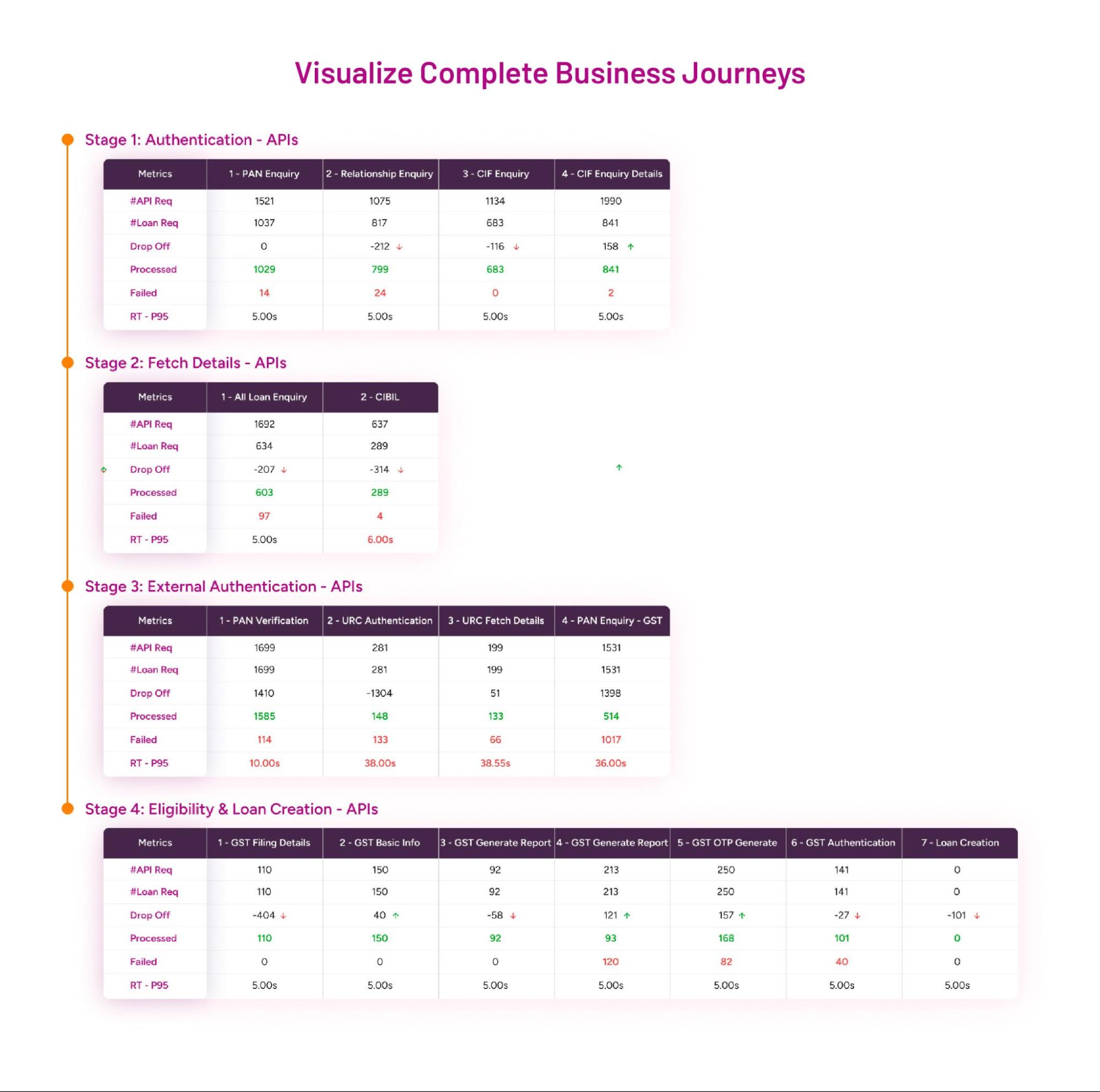 Visualize each customer action. From loan application to disbursement to EMI payment in real time, with visibility into internal systems and partner networks.