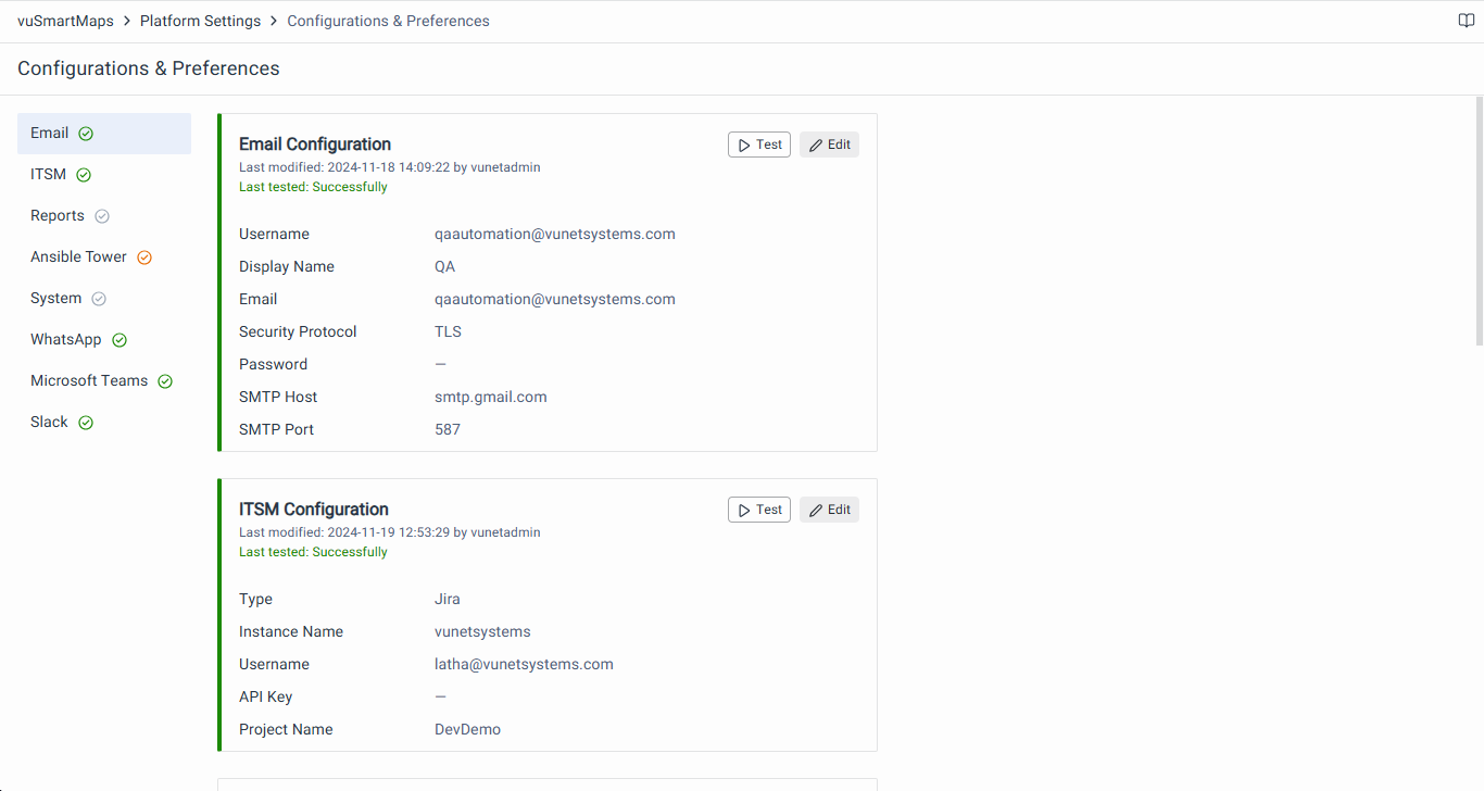 The Configurations & Preferences module in vuSmartMaps serves as a centralized hub for configuring system-level settings, enabling administrators to tailor the platform's behavior and integration capabilities. This functionality allows organizations to align vuSmartMaps with their specific operational needs, optimizing performance, enhancing automation, streamlining communication, and improving data management. Users can configure key parameters such as email notifications, IT Service Management (ITSM) integrations for automated ticketing, date and time formats for Reports, and connections to widely used communication platforms. This flexibility ensures that workflows are tailored to meet operational demands while improving overall system responsiveness and efficiency.