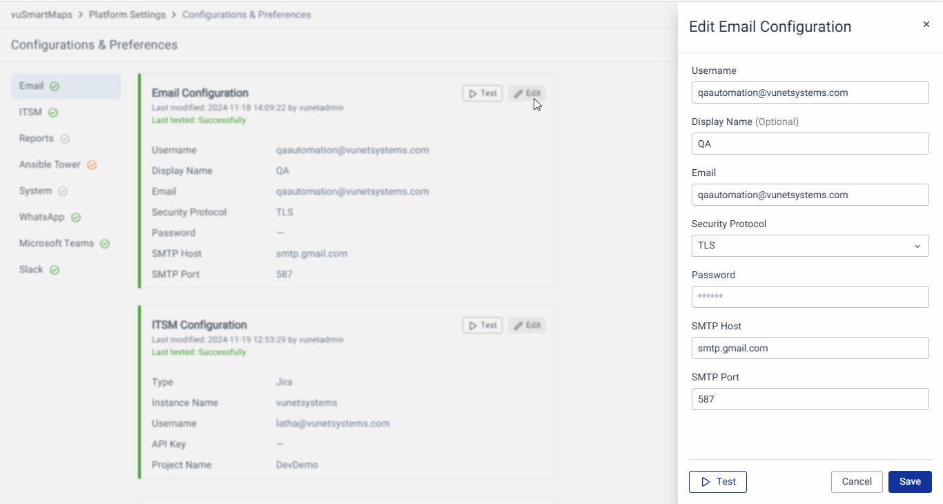Click the Test button to send a test email to a specified email address. Enter the recipient email ID in the prompted modal. A success message confirms delivery, while a failure message provides error details for resolution.