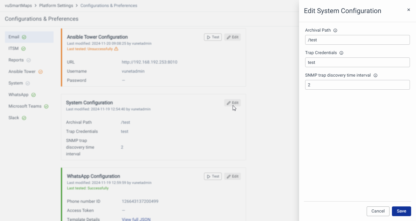 - Navigate to the Ansible Tower Configurations section on the Configurations & Preferences landing page. The Configurations can be configured in the modal by clicking on the Edit button.