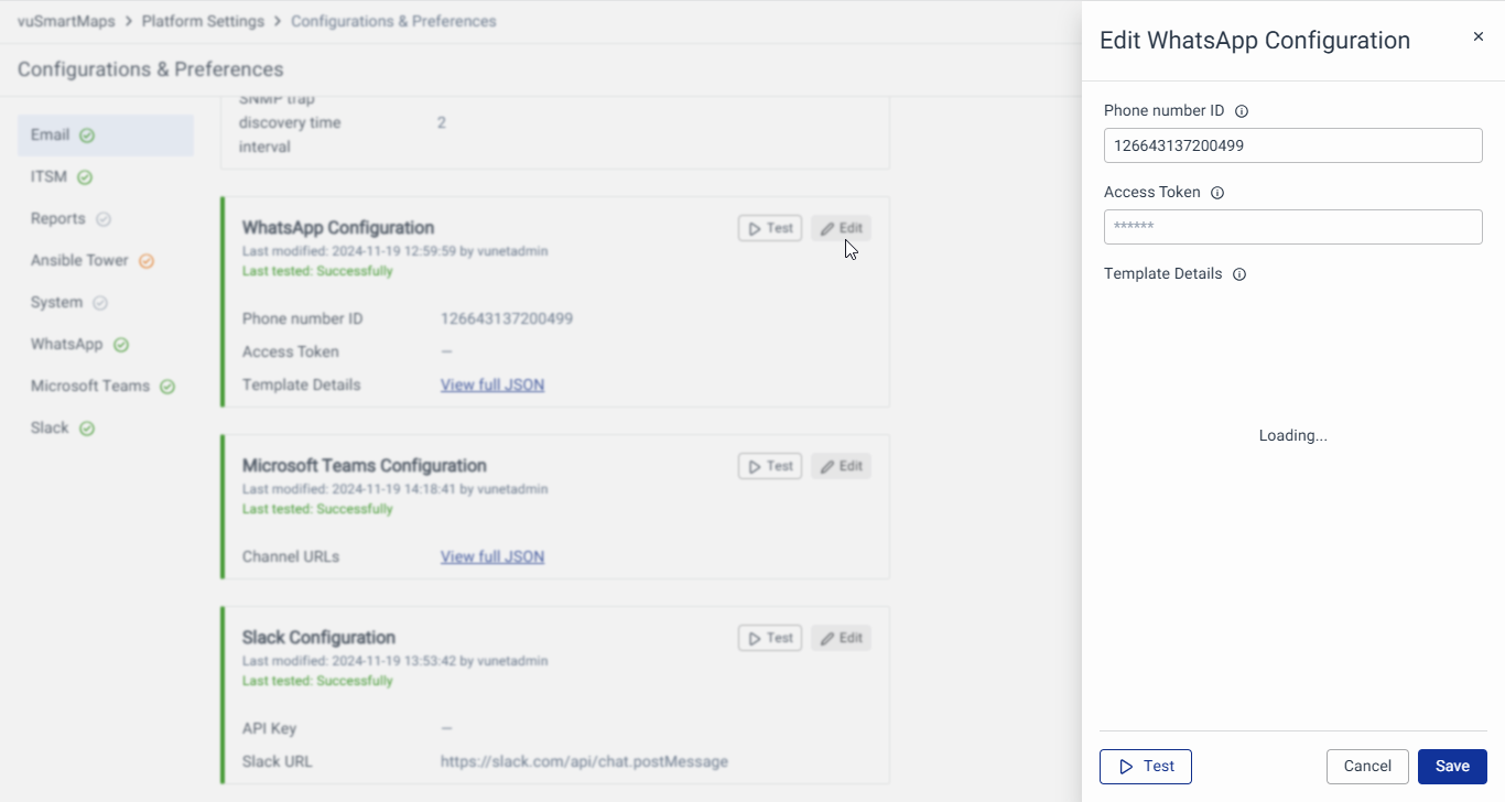 Alerts created on the platform are sent to multiple notification channels including WhatsApp. The Platform uses the official WhatsApp business API to send notifications. This is a one-time configuration. This doesn’t need to be updated for each and every alert rule unless there is a need to update. The below three fields for WhatsApp Configurations can be updated on the Configuration & Preferences page: