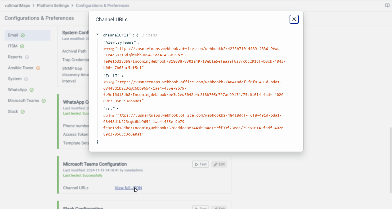 Alerts created in the platform are sent to multiple notification channels including MS Teams. For Each addition of incoming webhooks to a channel, it will generate a unique URL. These URLs are then added in the Configurations section as a JSON with the channel name as key and URL as value.