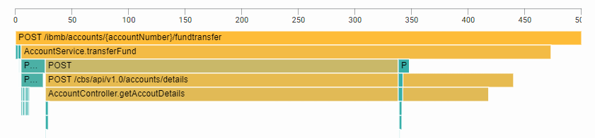 A flame graph visualizes a distributed request trace and represents each service call that occurred during the request’s execution path with a timed, color-coded, horizontal bar. Flame graphs for distributed traces include error and latency data to help developers identify and fix bottlenecks in their applications. An example of the flame graph is shown below: