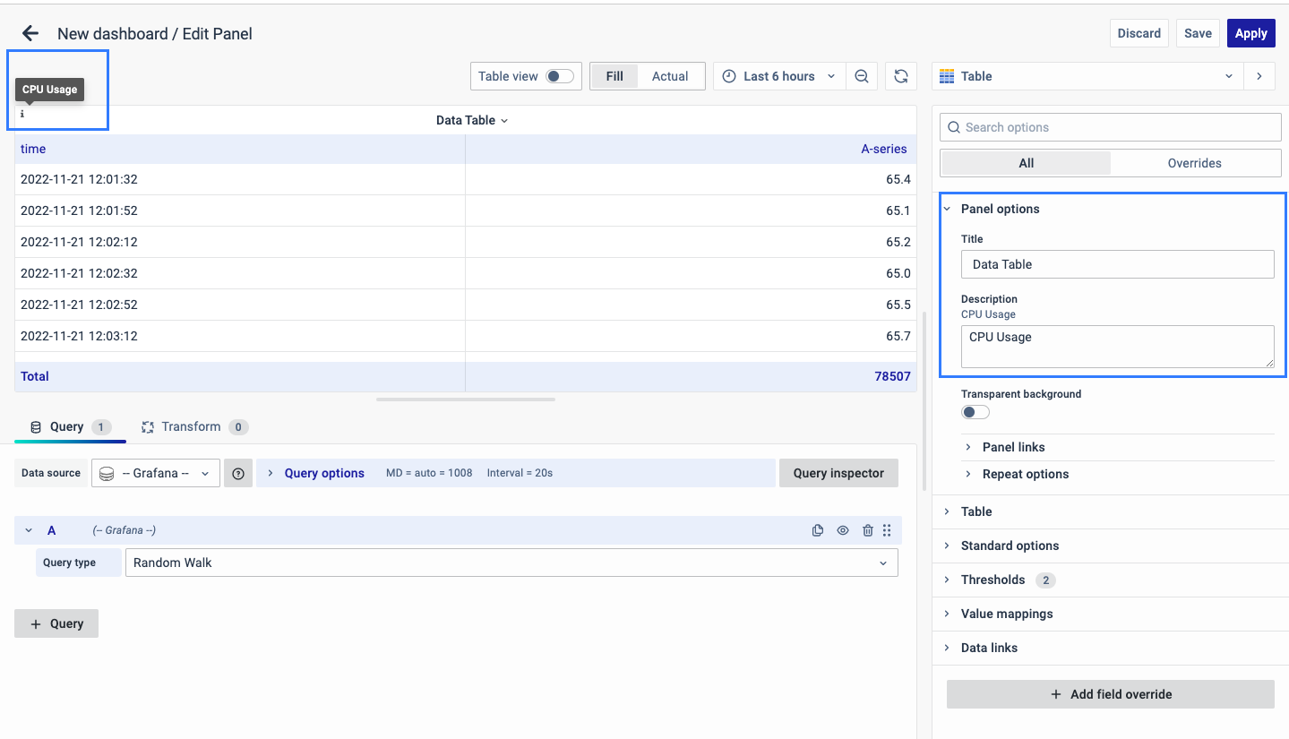 There are multiple options to edit the properties of the panel. The first one is Panel Options. Enter a Name and Description for the Panel that you want to create. For instance, if you're making a Data Table to track CPU usage, name the panel "Data Table" and describe it as "CPU Usage."