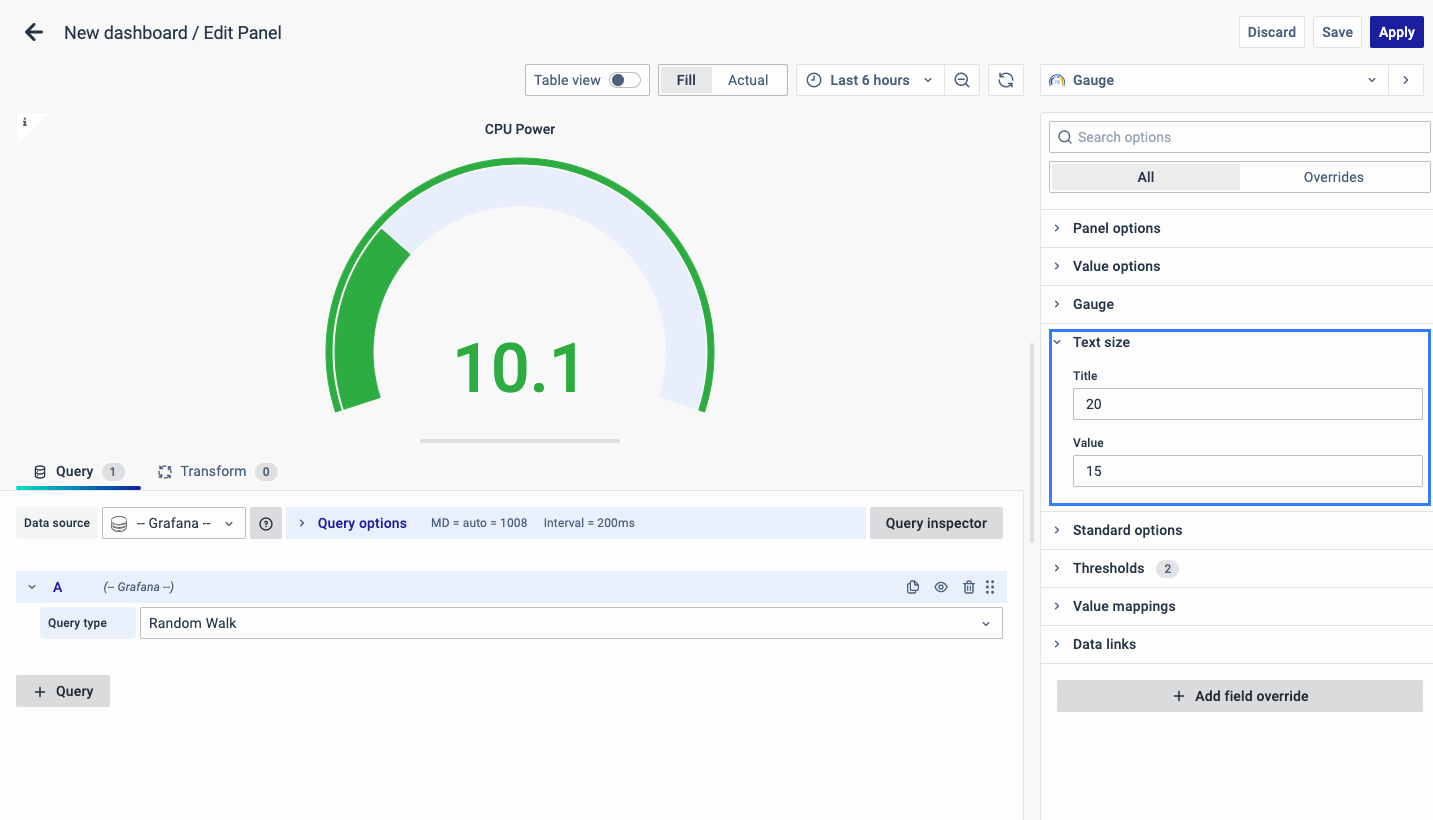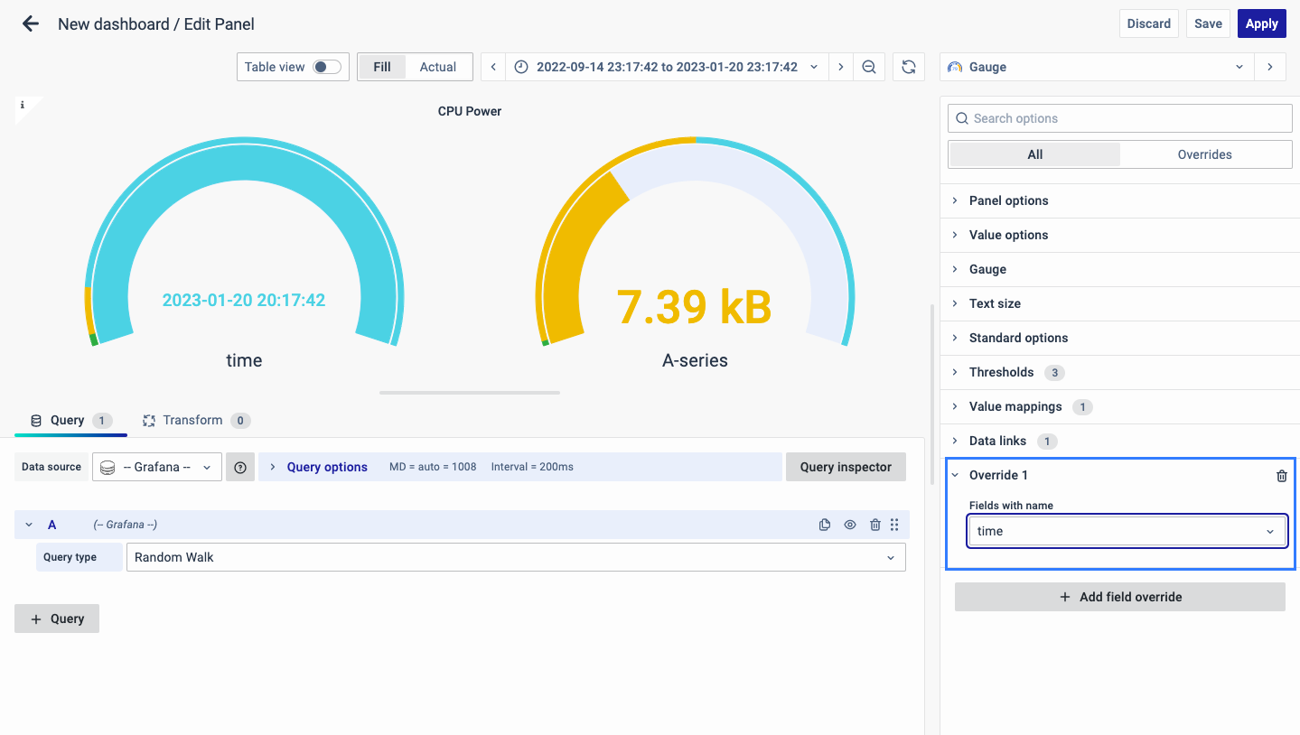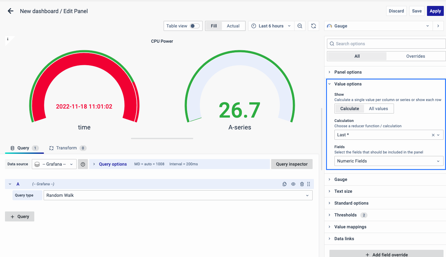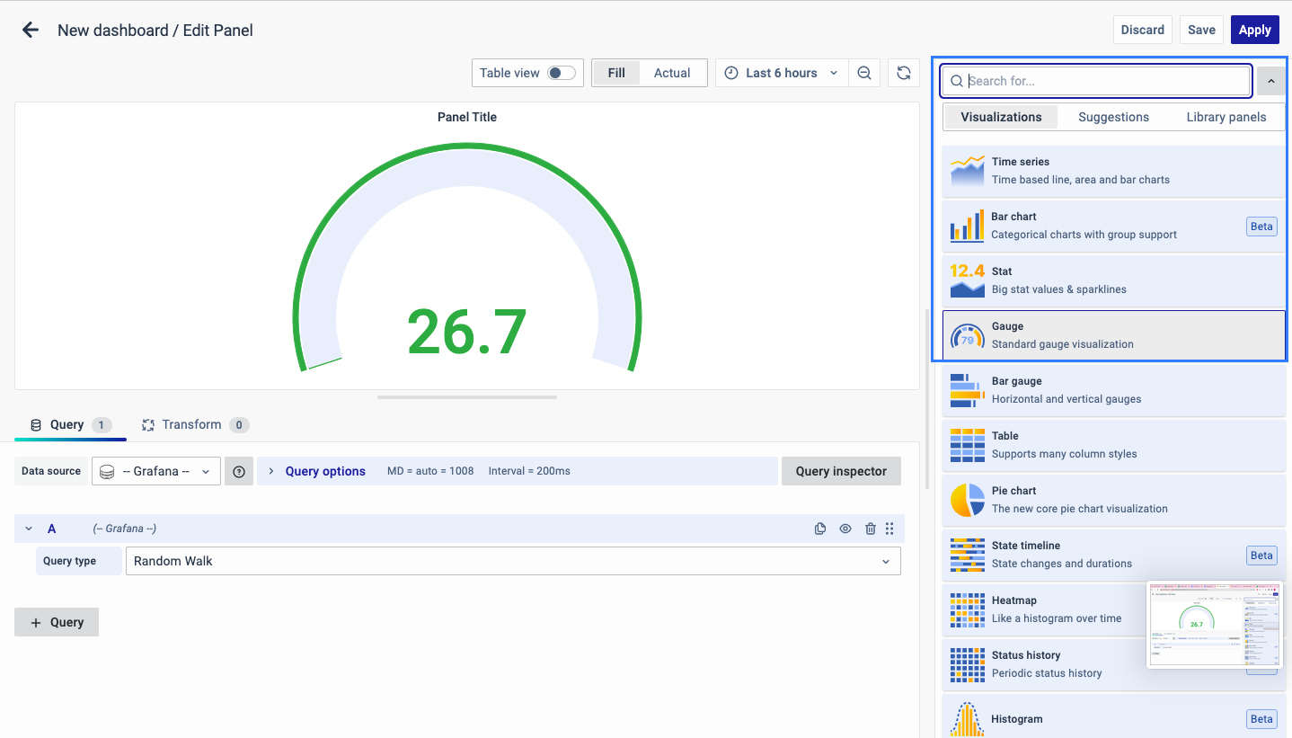 On the right side of the default screen, select Visualization as Gauge to create a Gauge Chart panel.