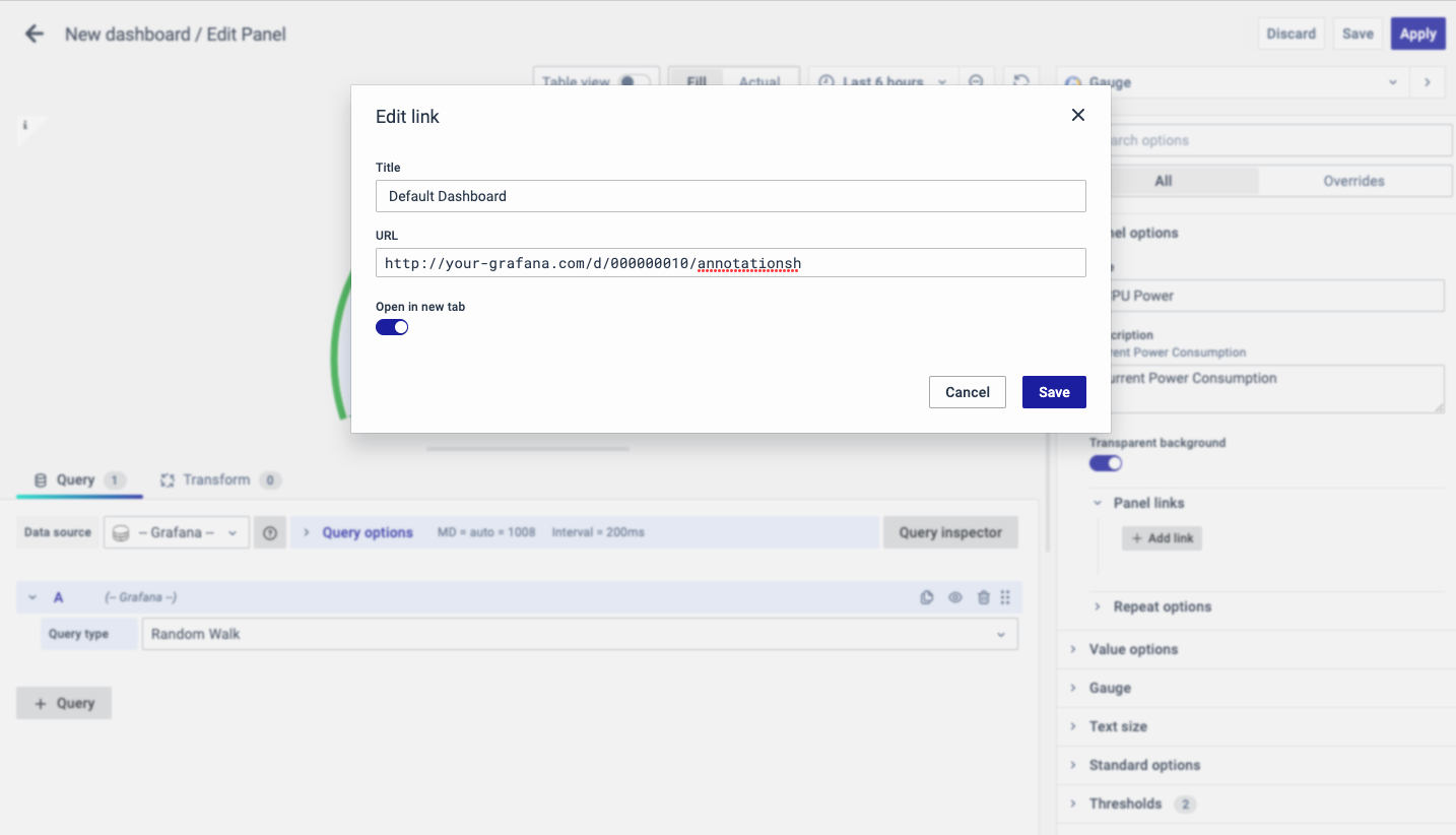 The URL can be a link to another dashboard or for getting help or useful info. When you click on a panel, it opens the link either in the same tab or a new tab, depending on your choices. For example, if you want to compare a default dashboard, just click the link to open it.
