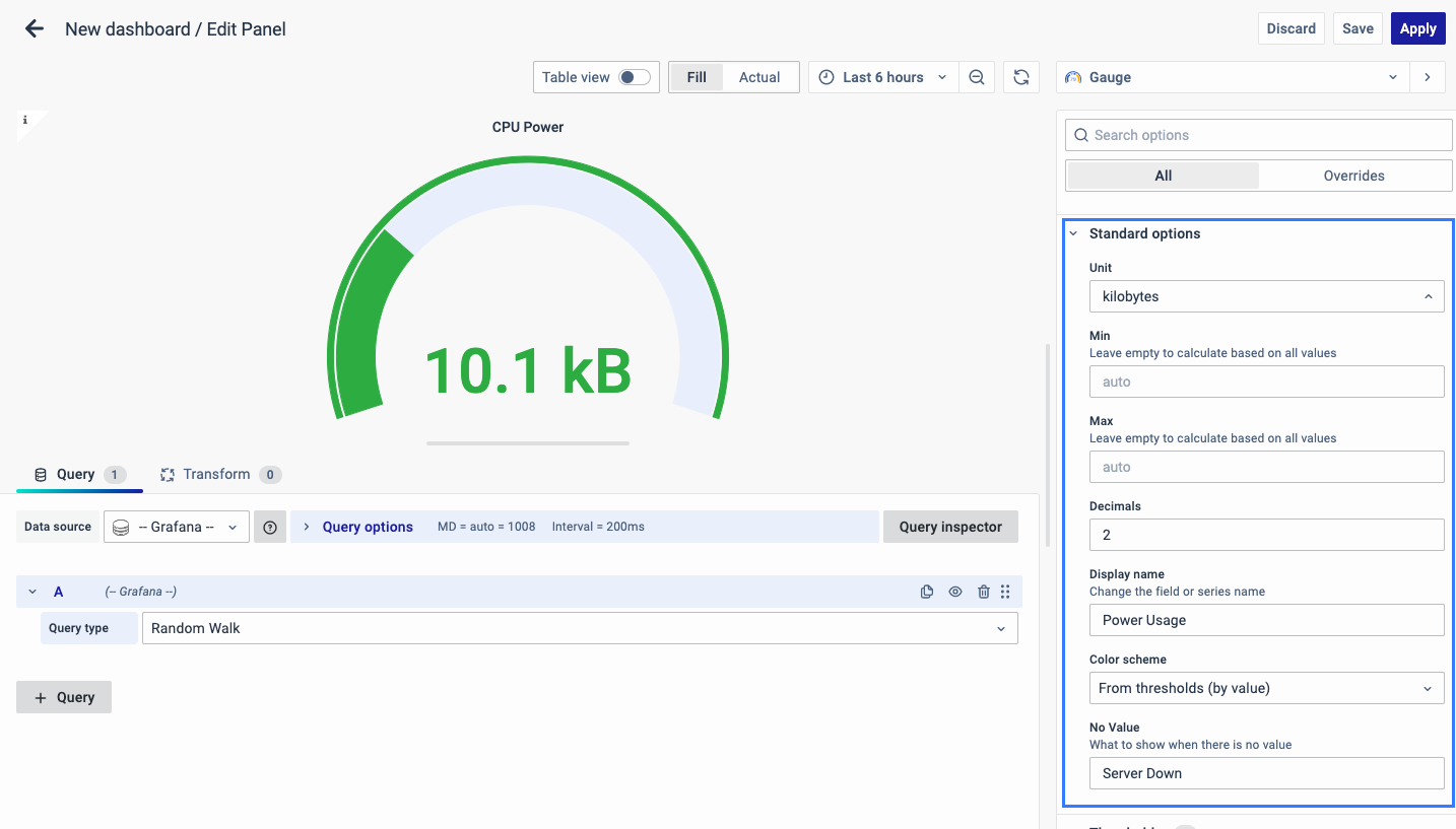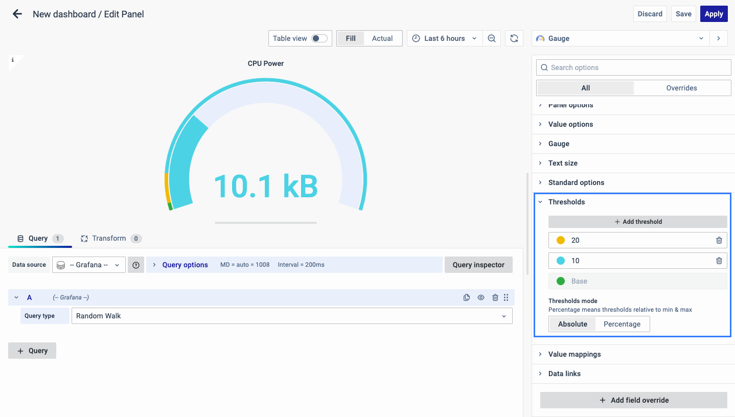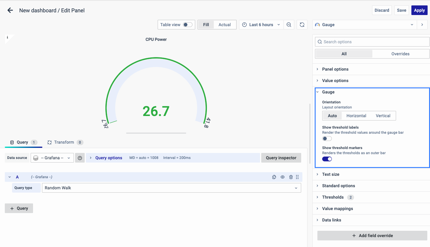 • Show threshold labels: Render the threshold value around the gauge bar.