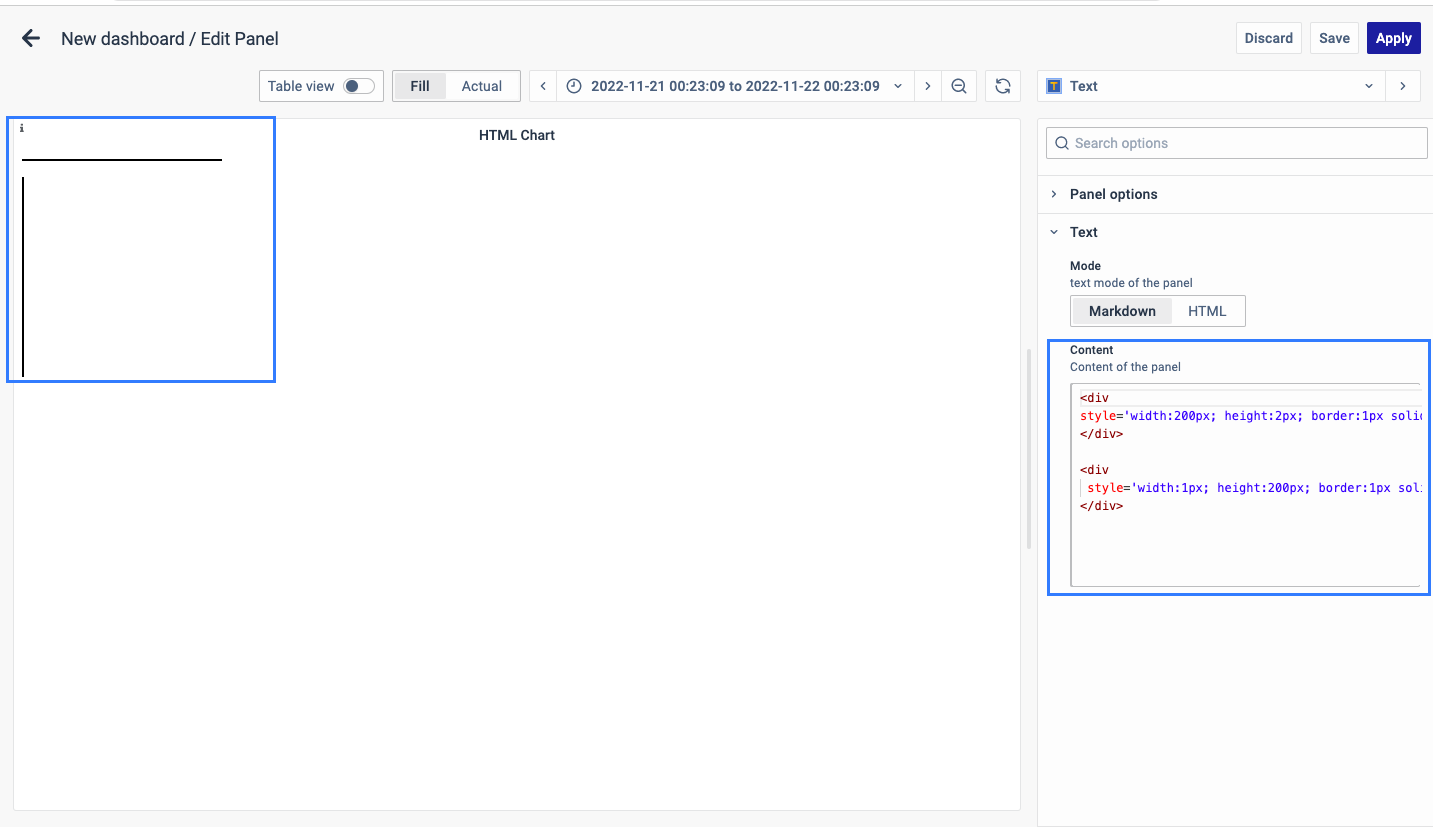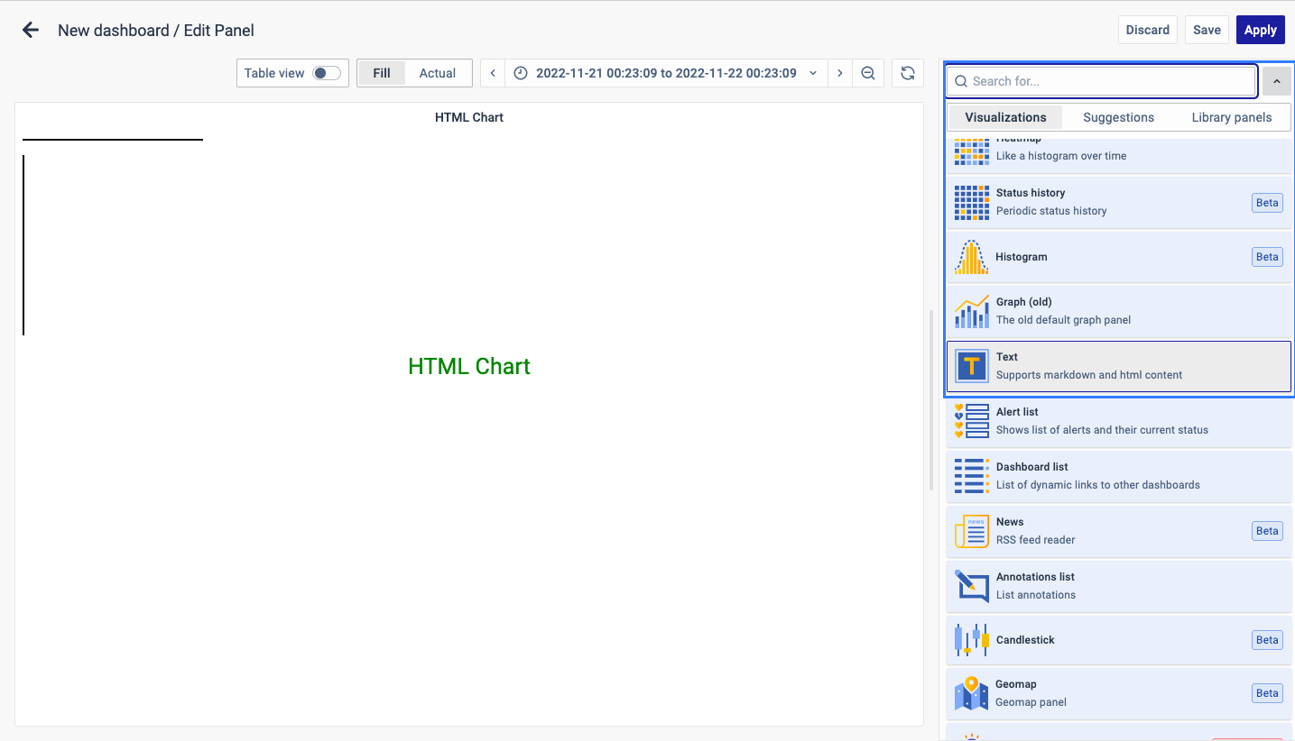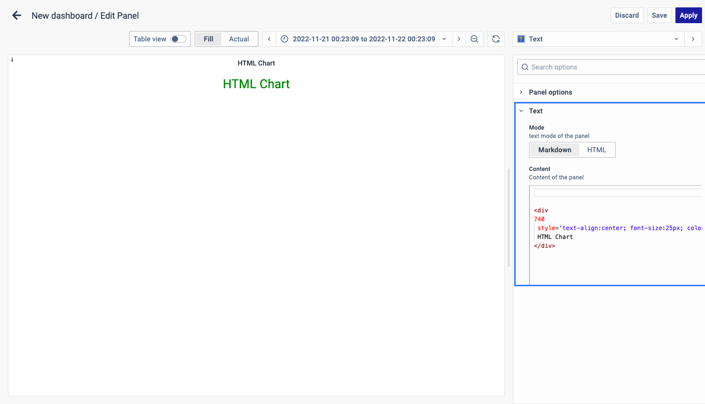 On the right side of the default screen, select Visualization as Text to create an HTML panel.