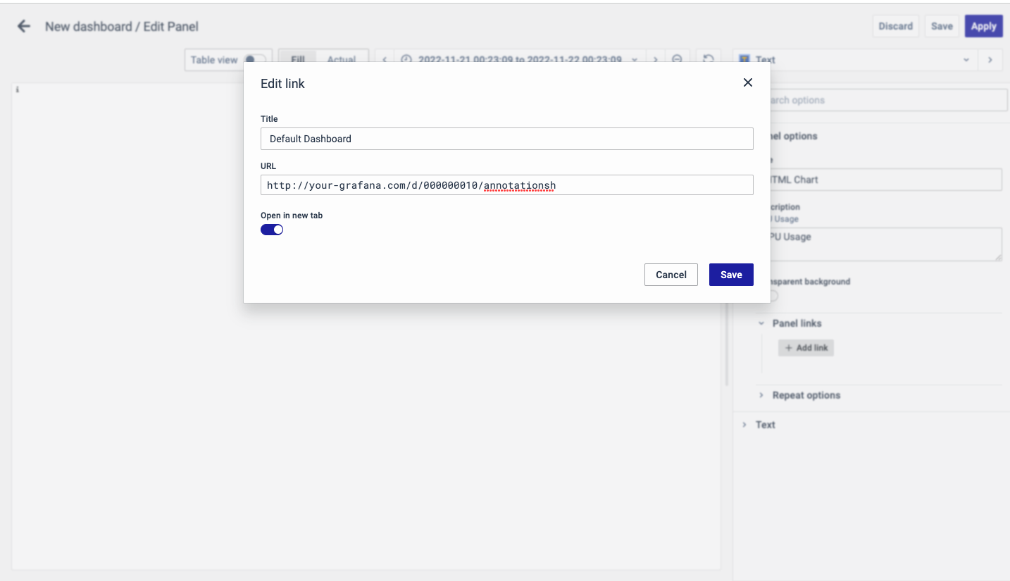 The URL can be a link to another dashboard or for getting help or useful info. When you click on a panel, it opens the link either in the same tab or a new tab, depending on your choices. For example, if you want to compare a default dashboard, just click the link to open it.