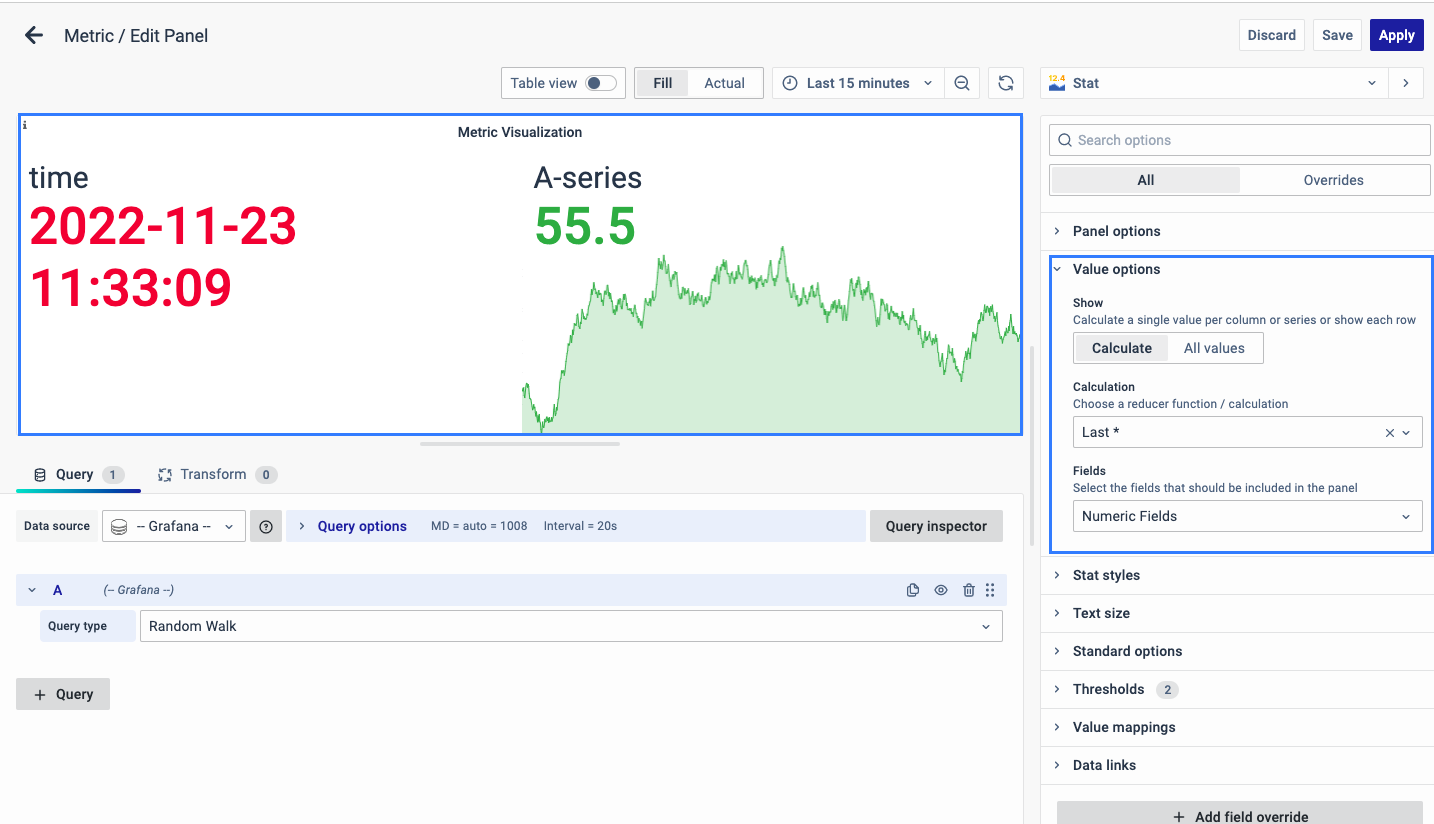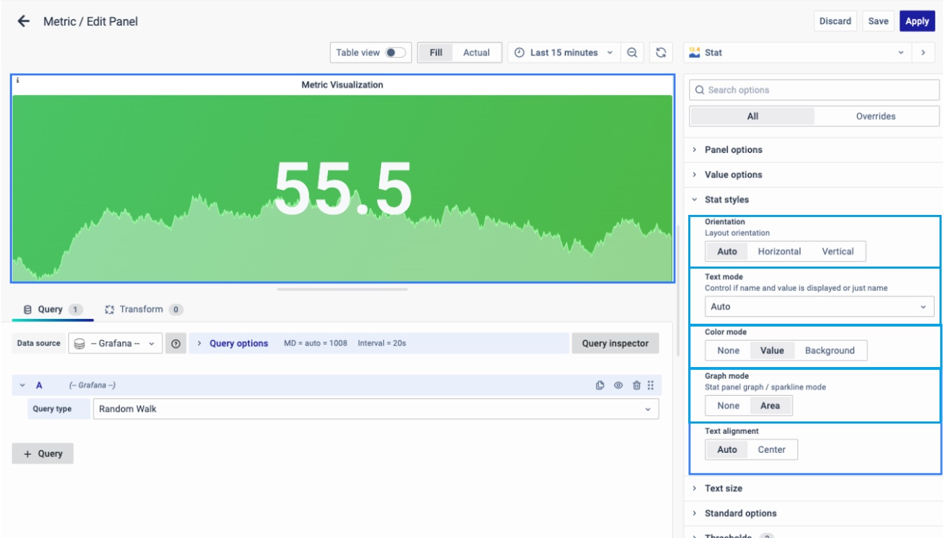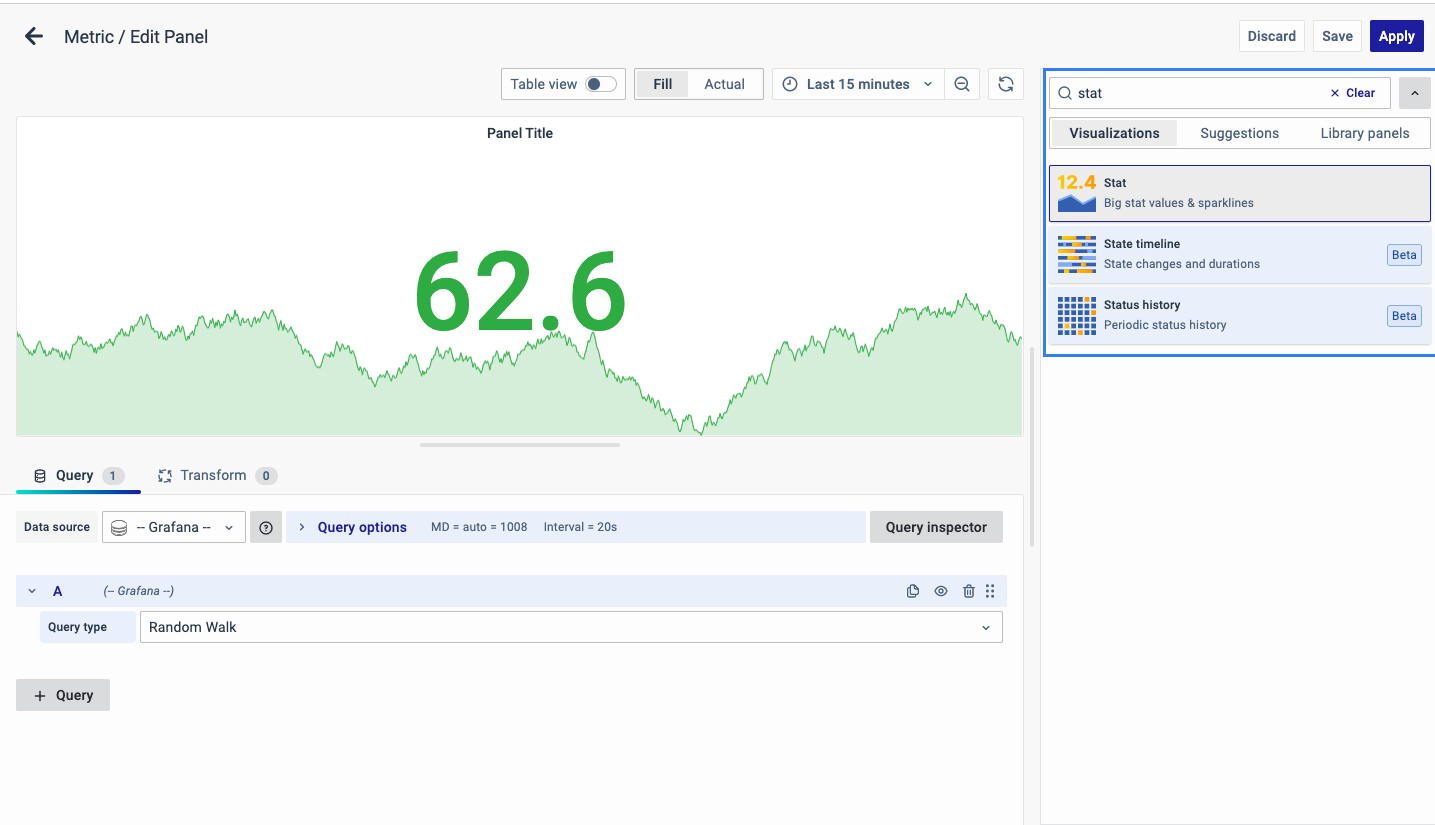 On the right side of the default screen, select Visualization as Stat to create a Metric panel.