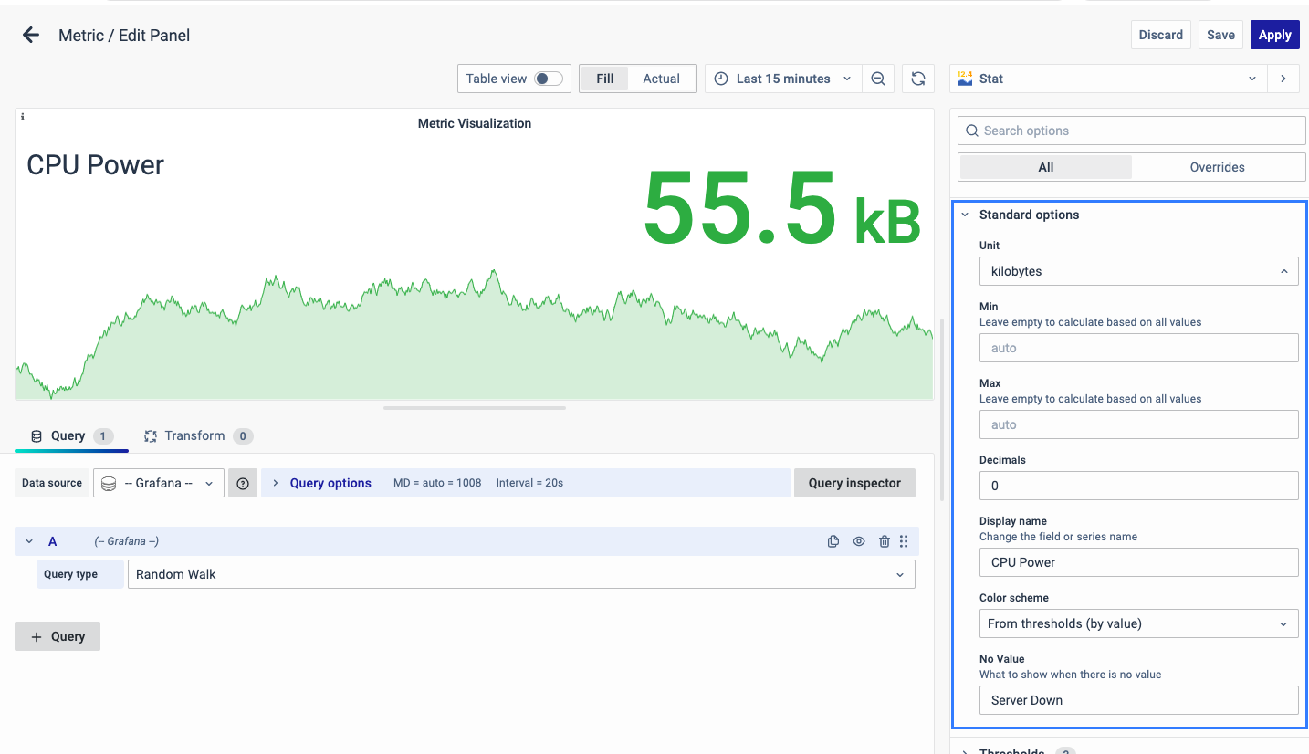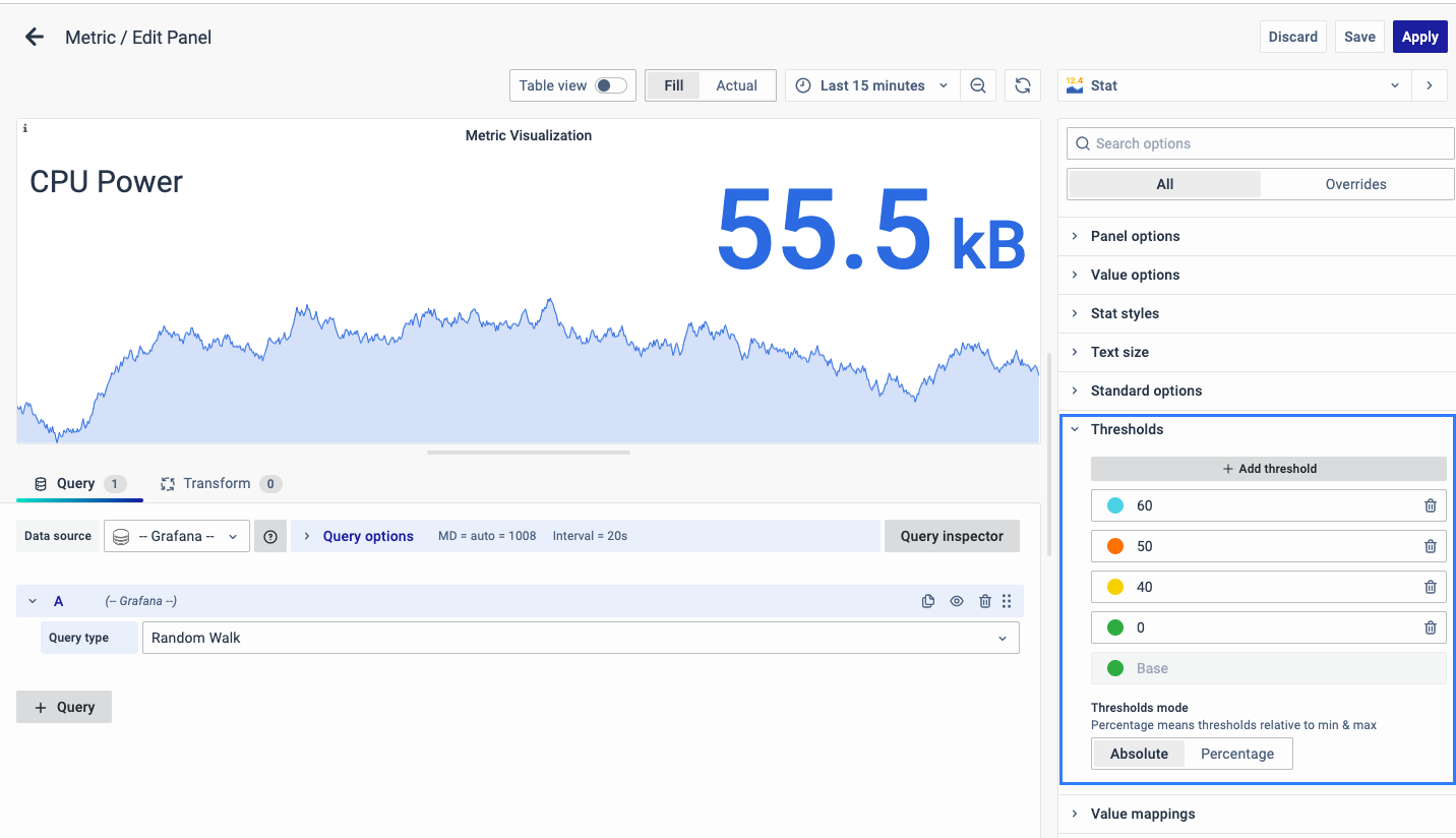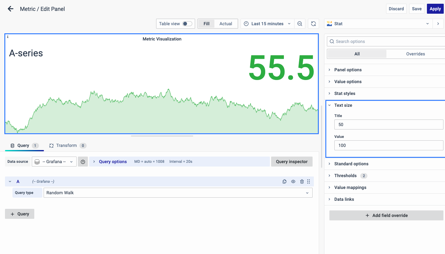 On the right side of the default screen, select Visualization as Stat to create a Metric panel.