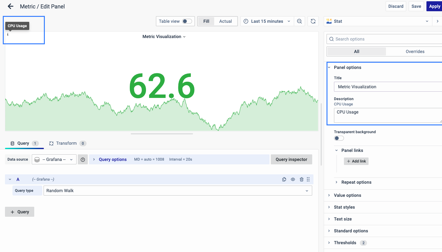 There are multiple options to edit the properties of the panel. The first one is Panel Options. Enter a Name and Description for the Panel that you want to create. For instance, if you're making a metric visualization to track CPU usage, name the panel "Metric Visualization" and describe it as "CPU Usage."