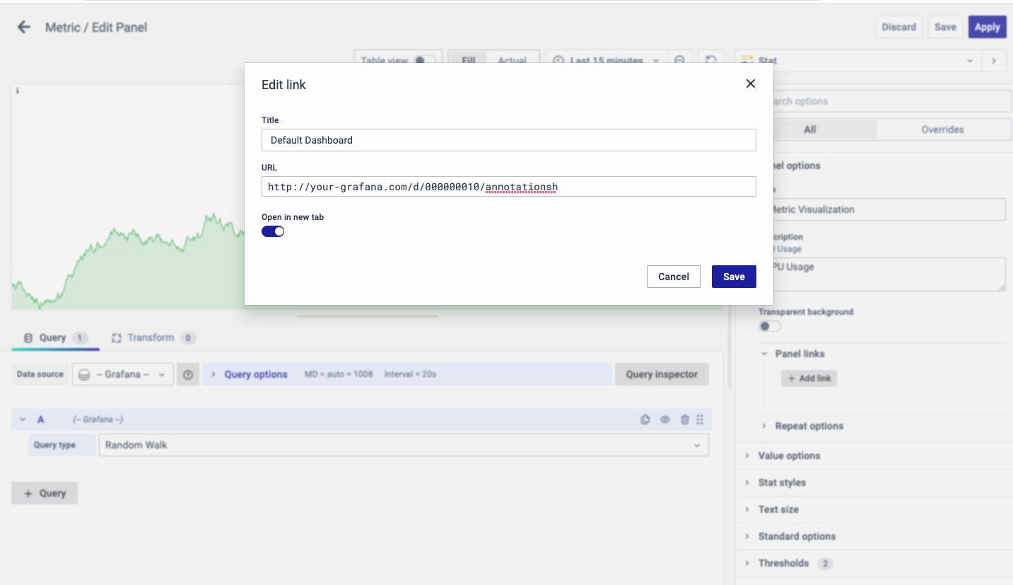 The URL can be a link to another dashboard or for getting help or useful info. When you click on a panel, it opens the link either in the same tab or a new tab, depending on your choices. For example, if you want to compare a default dashboard, just click the link to open it.