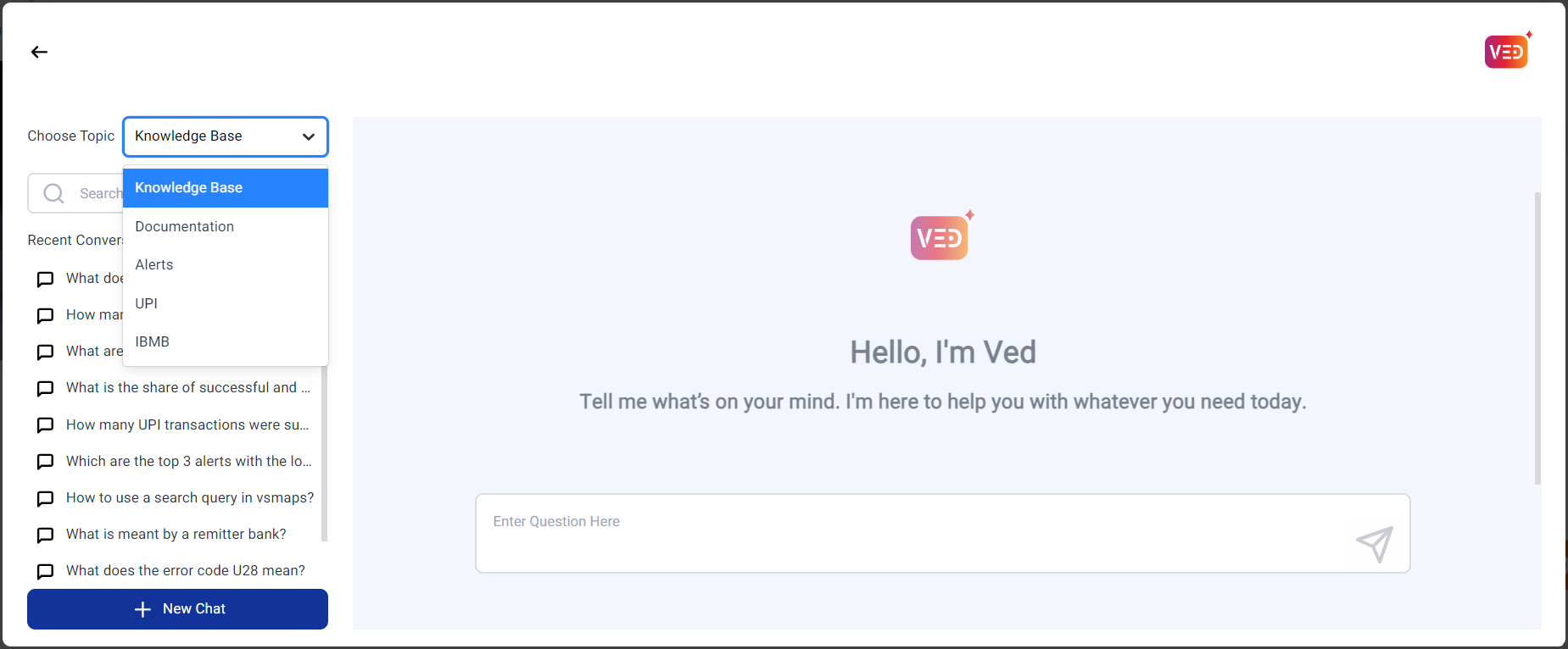 Access Ved: Click on the Ved icon located at the bottom right corner of any page. Note that the icon can be minimized and remains accessible across all pages.