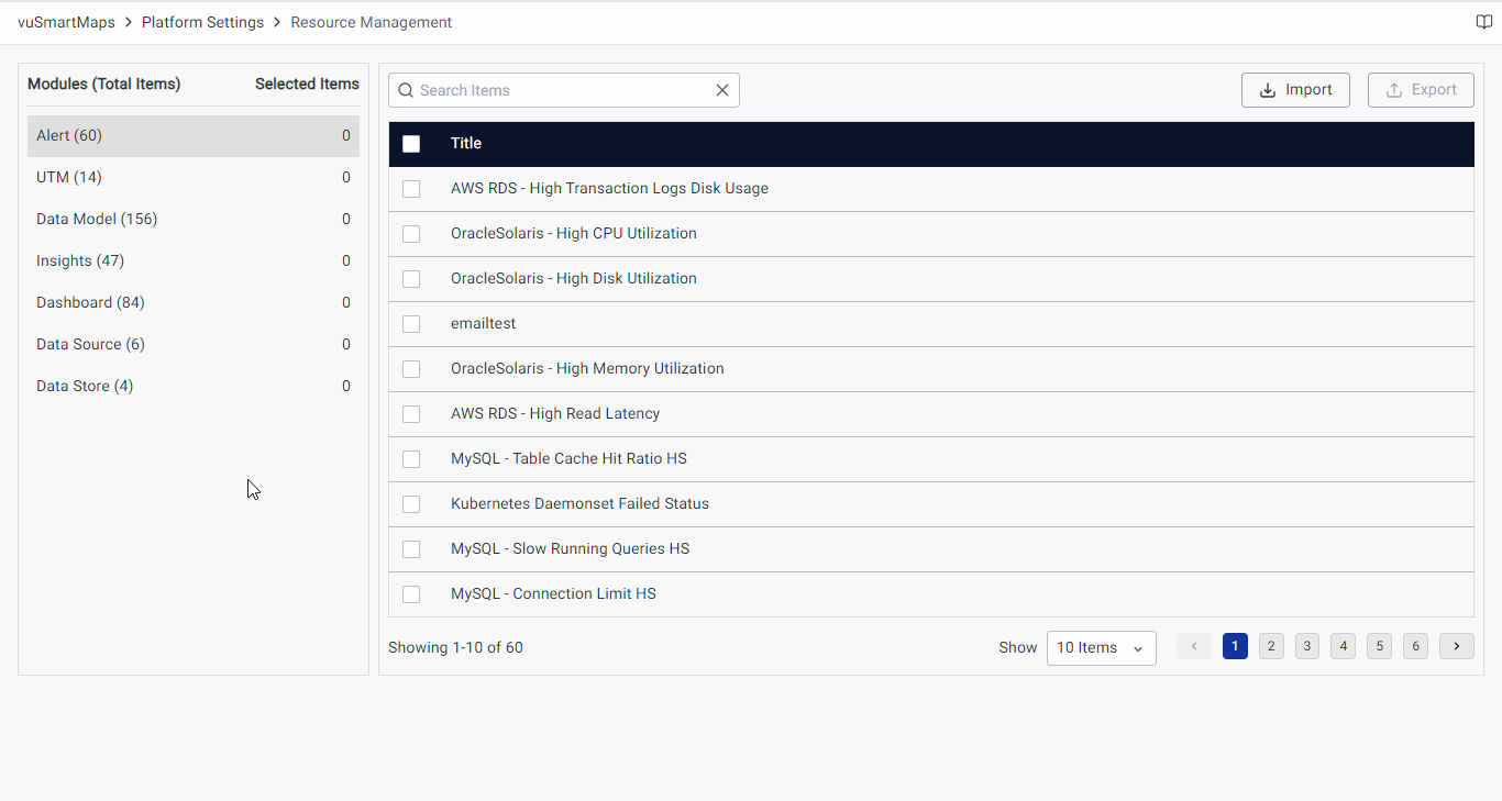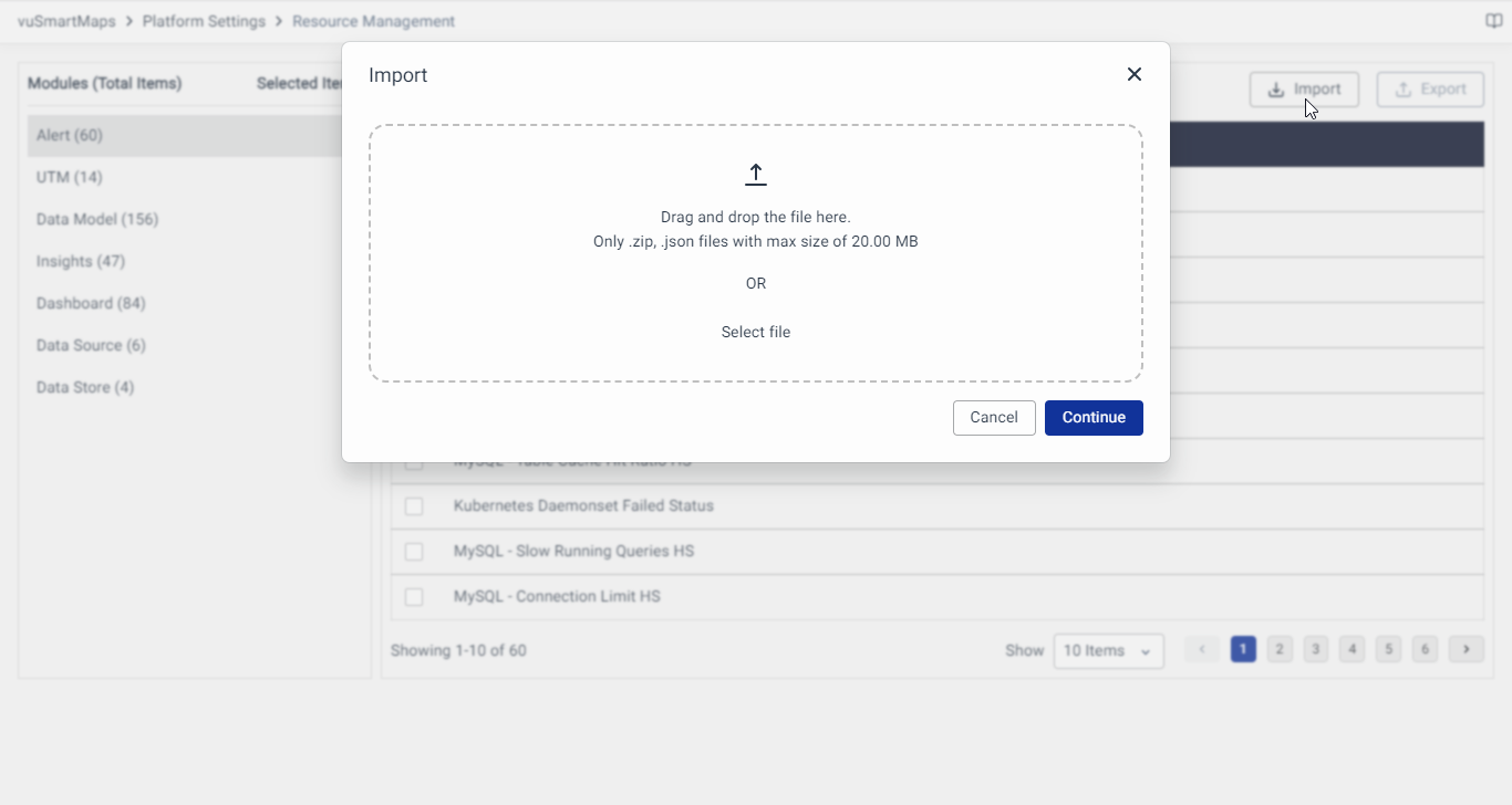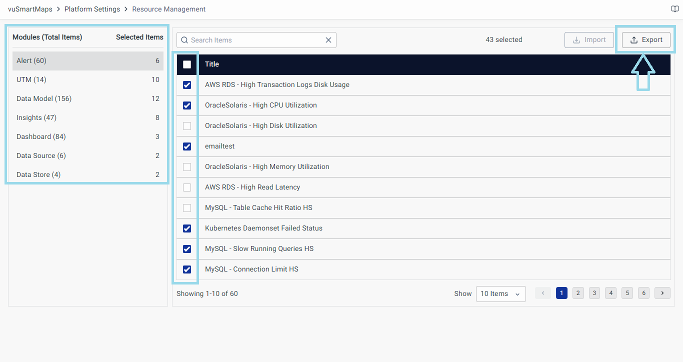 In this use case, Resource Management empowers you to efficiently export various components, ensuring a seamless and straightforward experience. It centralizes access, simplifies selection, and ultimately boosts productivity, enabling you to make the most of your vuSmartMaps platform.