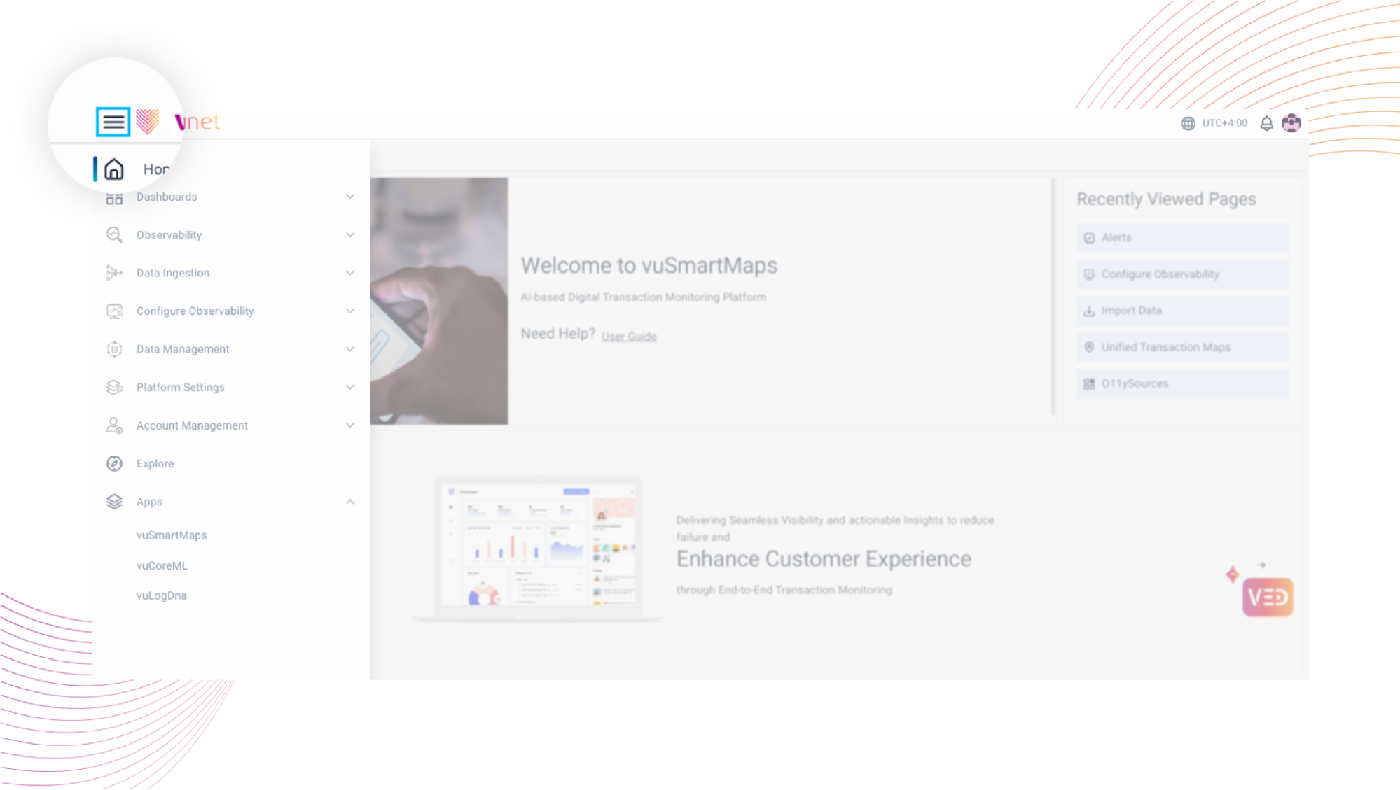 - To access the Homepage navigate to the Left Navigation menu-> App-> vuSmartMaps.