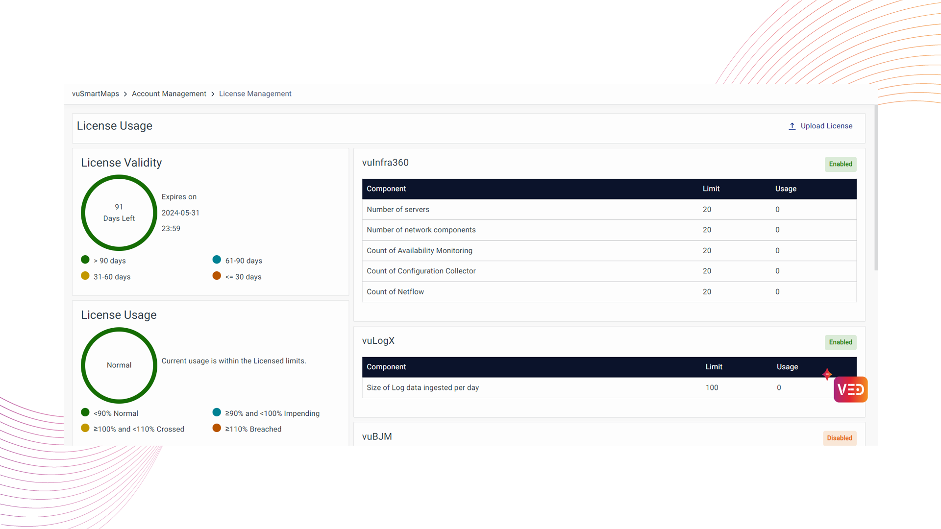 - License Management in vuSmartMaps: Control, monitor, and access critical licensing details and settings seamlessly through the dedicated tab. For more information, refer to the License Management.