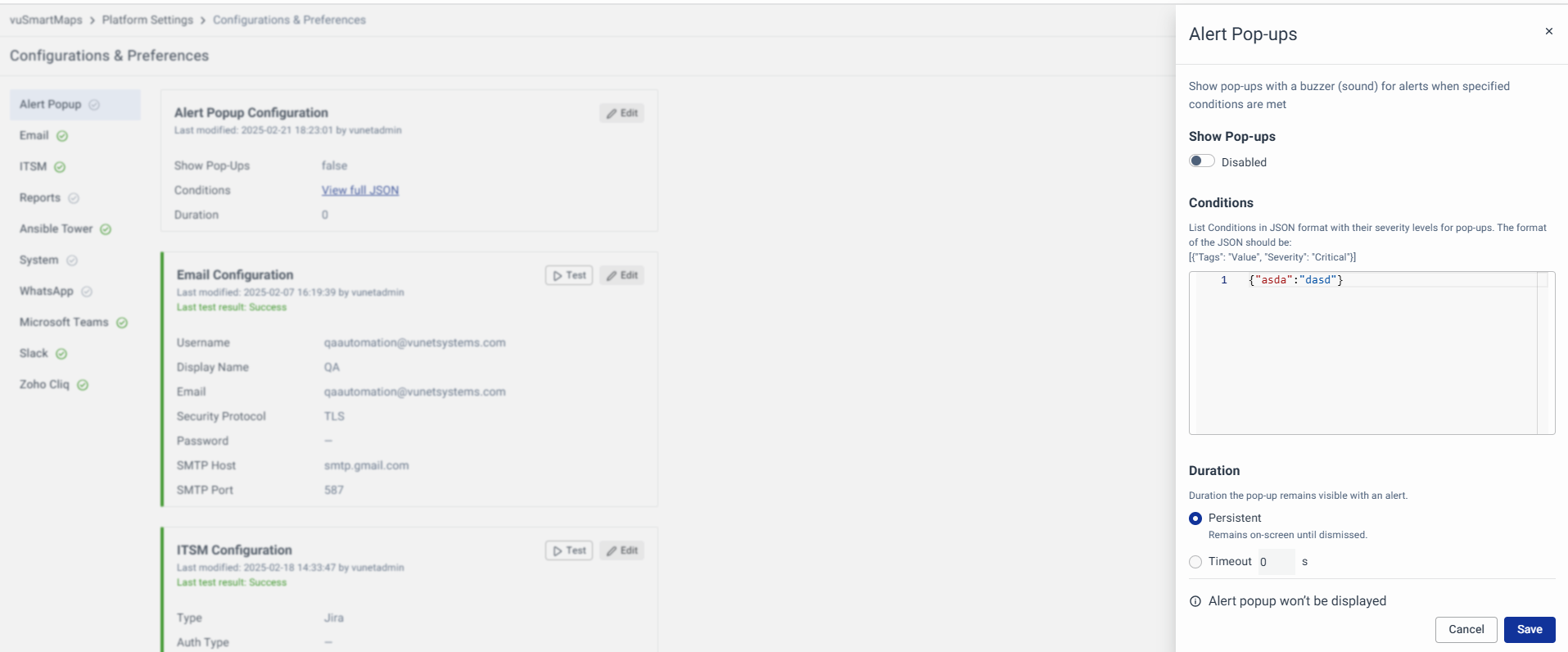 - Only users with the necessary access to Configurations & Preferences in User Management and RBAC can add or edit Global Alert Pop-Ups Configurations.