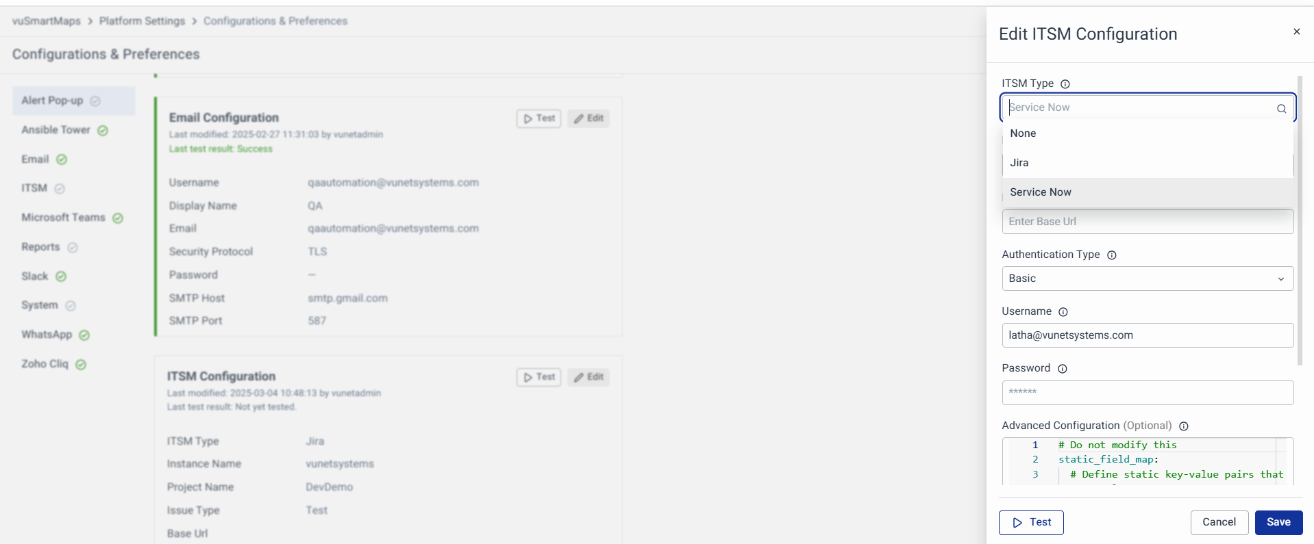 Click the Test button to validate the configuration to ITSM. For Configured ITSM, a test ticket is created to ensure a successful connection. Errors, such as permission issues or missing fields, are displayed if applicable.