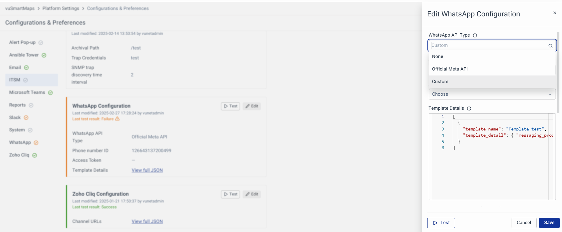 The platform supports WhatsApp integration for sending alerts and notifications. Users can configure WhatsApp as a notification channel to ensure timely updates. They can choose between two configuration methods: