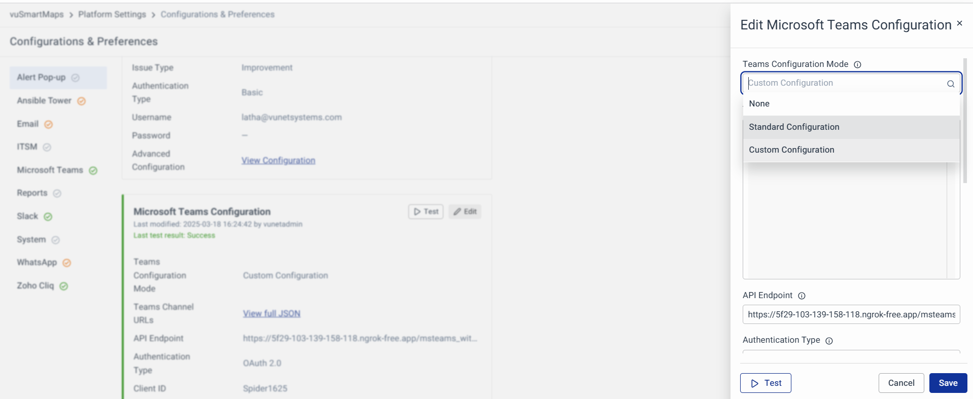Custom Configuration: The Custom Configuration mode offers flexibility by allowing users to specify an MS Teams API endpoint and define advanced settings.