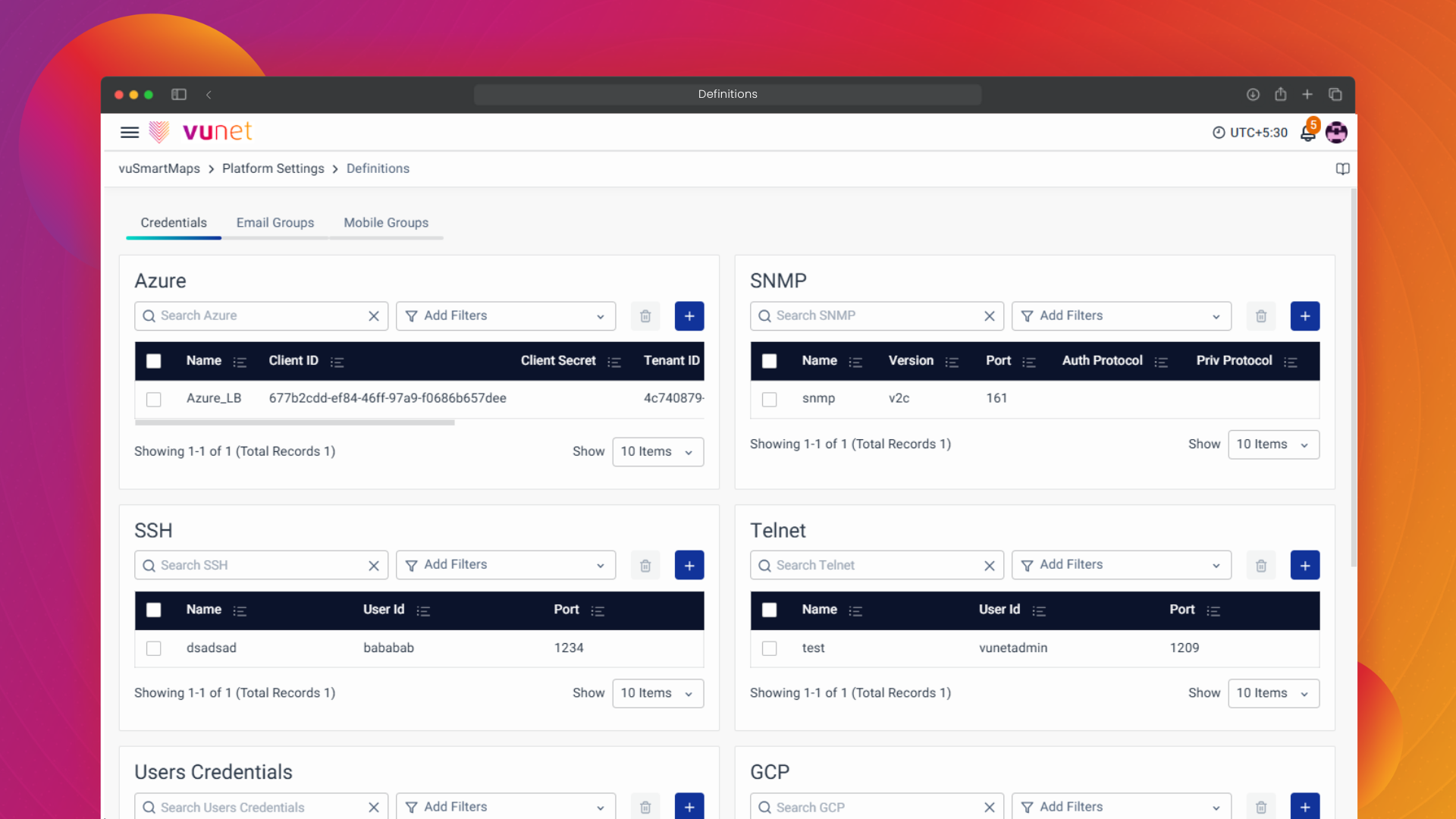 The Definitions module plays a pivotal role in vuSmartMaps by allowing users to configure credentials and communication groups. Its importance lies in ensuring secure access control and efficient communication within the platform. Users can establish various credentials like SSH, Telnet, SNMP, User, and Cloud Provider, simplifying authentication processes. Additionally, Definitions facilitates the creation and management of Email groups and Mobile groups, making it convenient to organize users for notifications, alerts, reports, or other forms of communication.