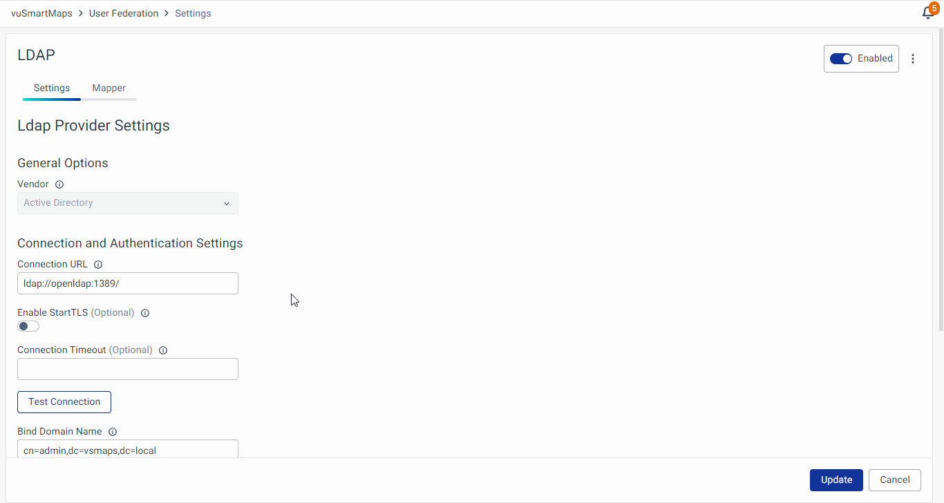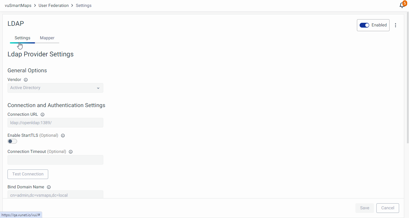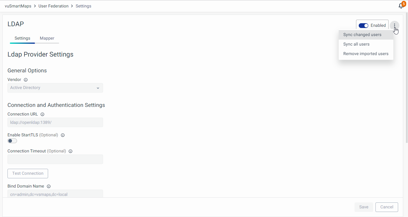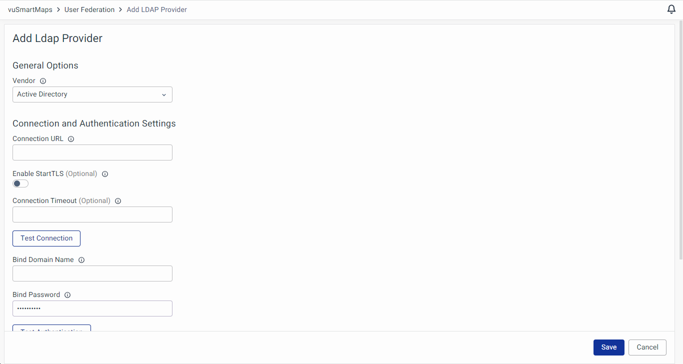 - User Model Attribute Name: Specifies the attribute in vuSmartMaps where the mapped LDAP attribute value will be stored.