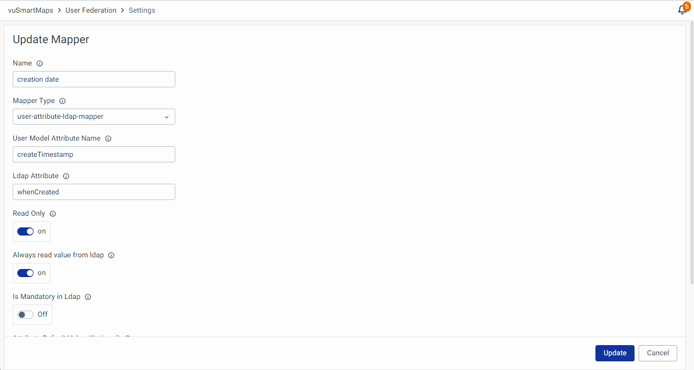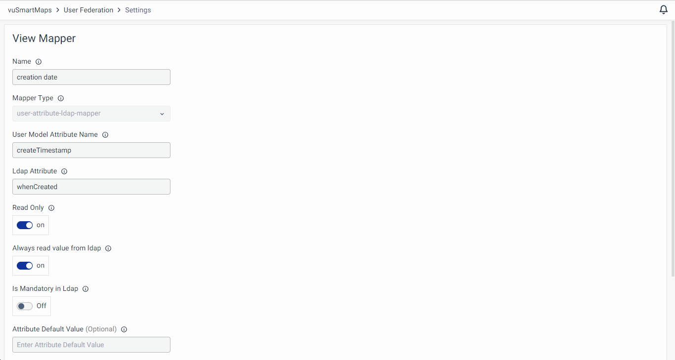 The User Attribute LDAP Mapper allows specific user attributes from LDAP to be mapped to the corresponding fields in vuSmartMaps. This ensures that user data such as email addresses, job titles, or department names are correctly synchronized between LDAP and vuSmartMaps.