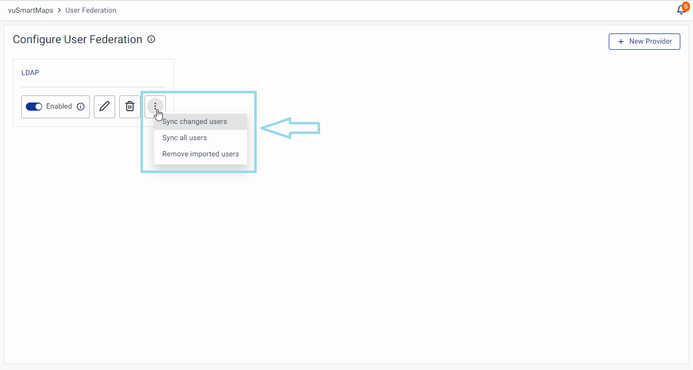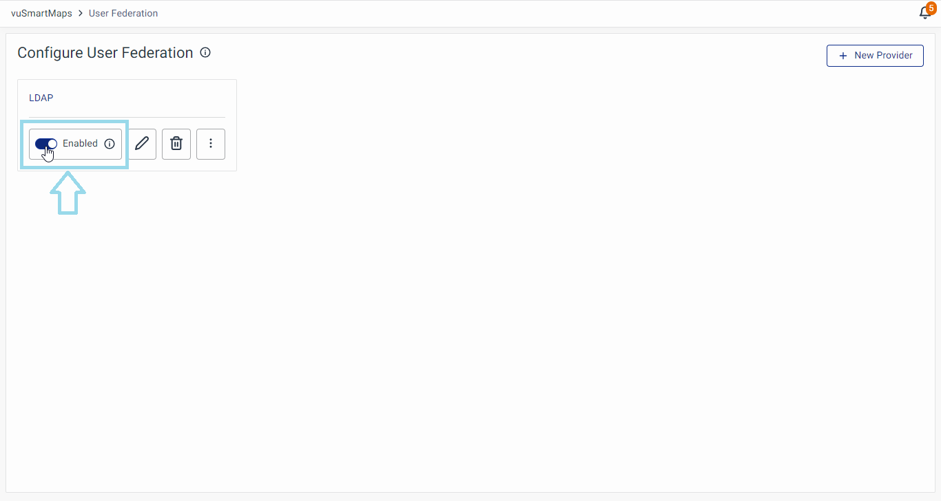 - To delete the existing LDAP configuration, click the Delete icon on the user federation landing page.