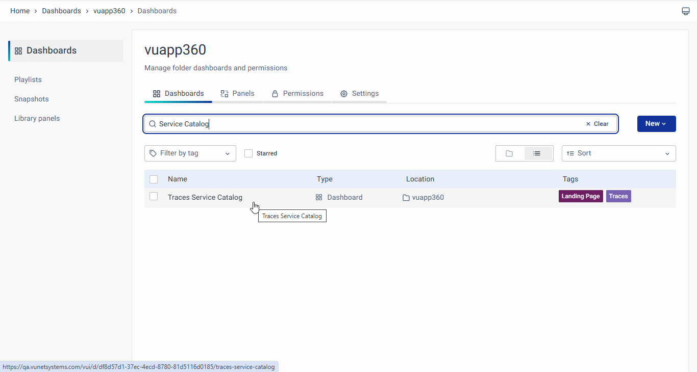 vuApp360 Dashboards, pre-packaged with vuApp360, can be accessed by navigating to the Dashboards UI from the left navigation menu, Dashboards. On the Dashboards landing page, Service Catalog can be accessed with the help of Search bar. The Service Catalog dashboard is stored under the vuApp360 folder.