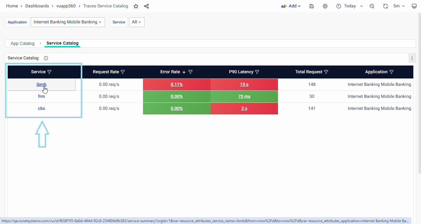 - Filter by Application/Service: Effortlessly filter the Service catalog to focus on a specific application and view the services involved in that particular application. This feature aids in isolating performance issues and understanding the specific application.