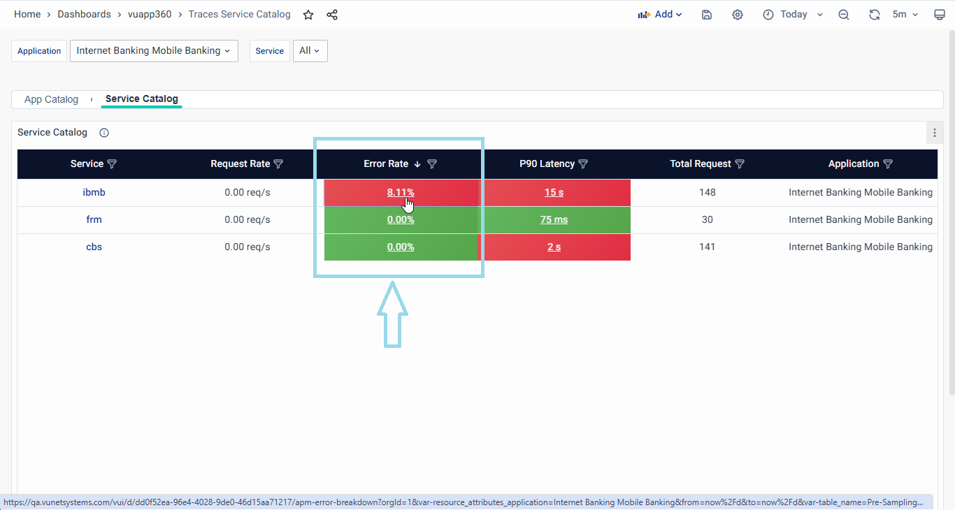 - Navigating to Error Rate Breakdown Page: Easily navigate to the Error Rate Breakdown Page by clicking on the relevant error metric showcased on the Application Catalog page. This user-friendly approach will instantly navigate you to the Error Rate Breakdown Dashboard, where you can gain insights into error occurrences within the selected application. For a thorough understanding of the capabilities offered by this page, refer to the detailed Error Rate Breakdown section in this guide.