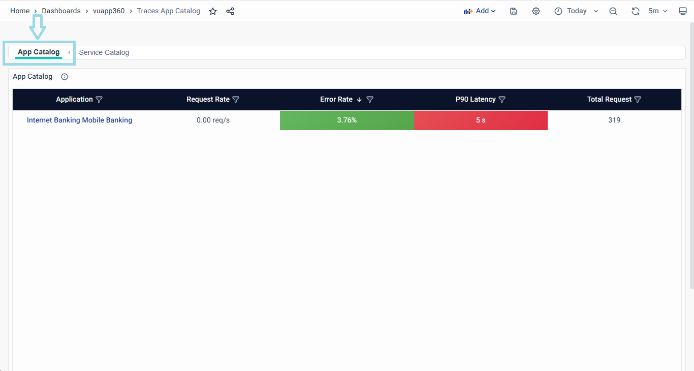 The App Catalog offers a bird's-eye view of all the applications in the environment, along with essential performance metrics and status information.